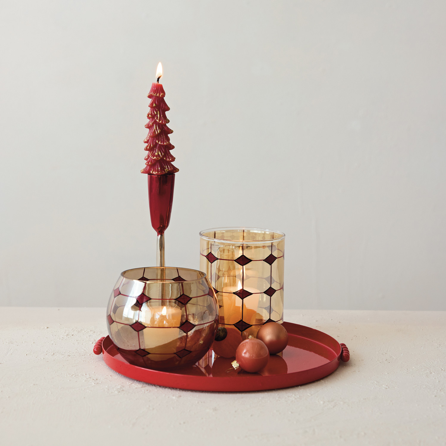 Catalog Name: 3-3/4" Round x 4-3/4"H Hand-Blown Glass Tealight/Votive Holder w/ Hand-Painted Grid & Diamond Pattern, Pearlized Finish, Red & Black