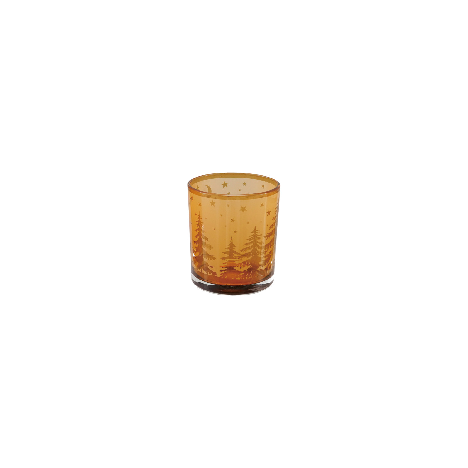 Glass Tealight/Votive Holder with Laser Etched Deer & Trees, Amber Color