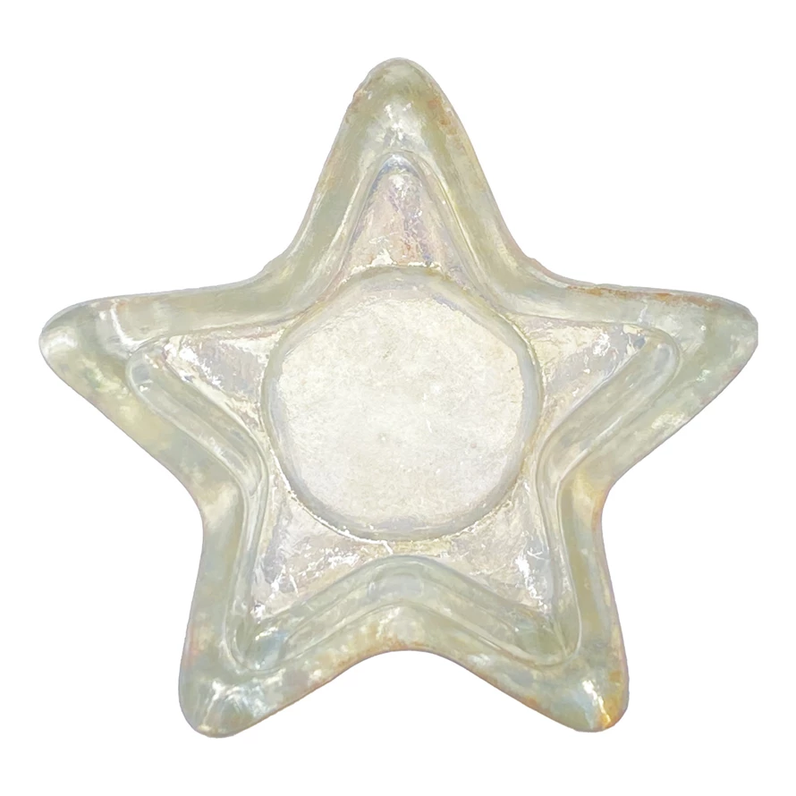 Catalog Name: 3-1/2"L x 3-1/2"W Pressed Frosted Glass Star Shaped Tealight Holder, Antique Silver Finish