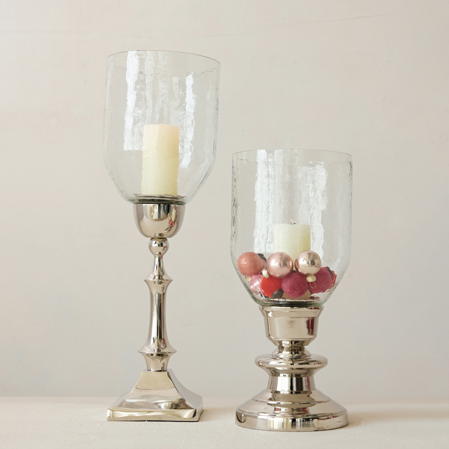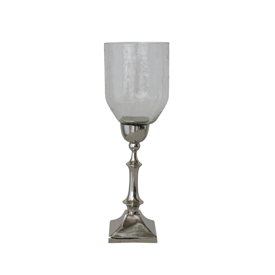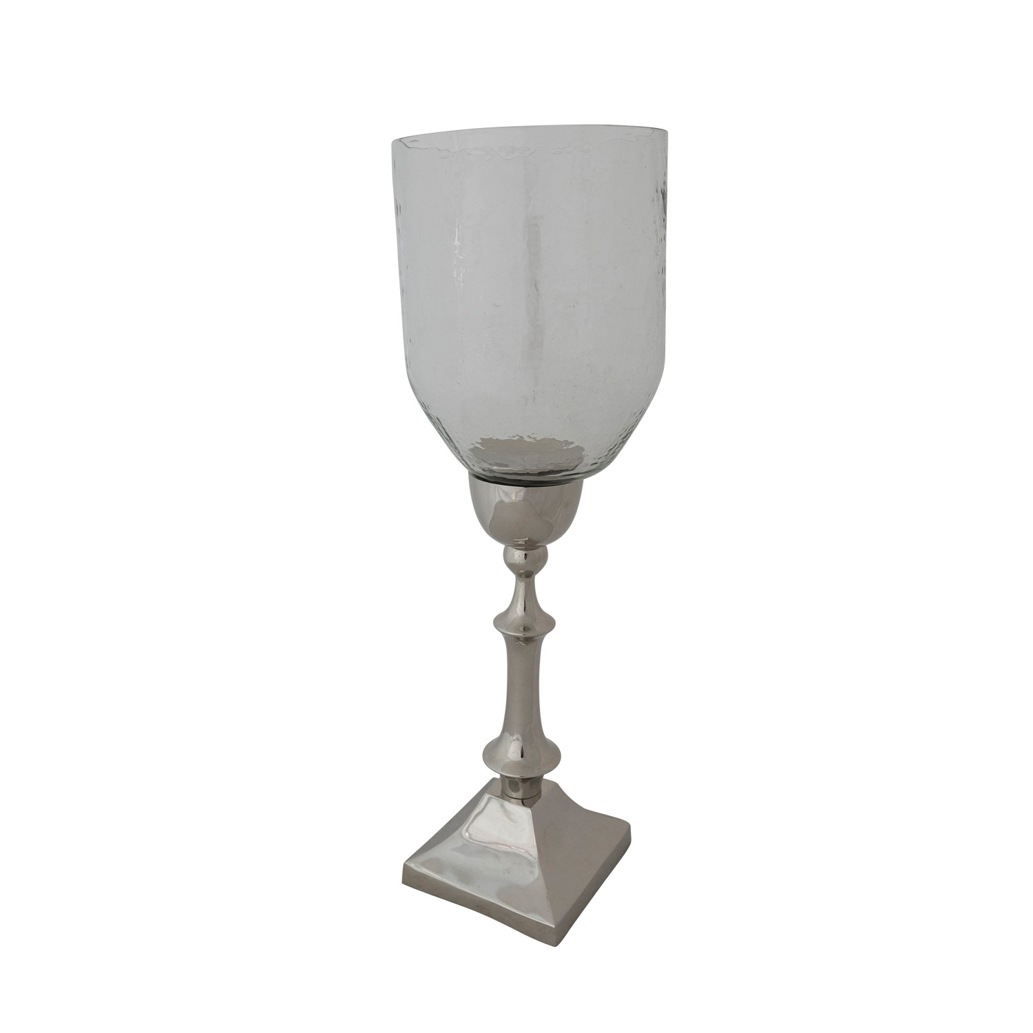 Catalog Name: 6-1/4" Round x 19"H Glass Hurricane w/ Cast Aluminum Base, Nickel Finish, KD (Holds 2-1/2" Pillar)