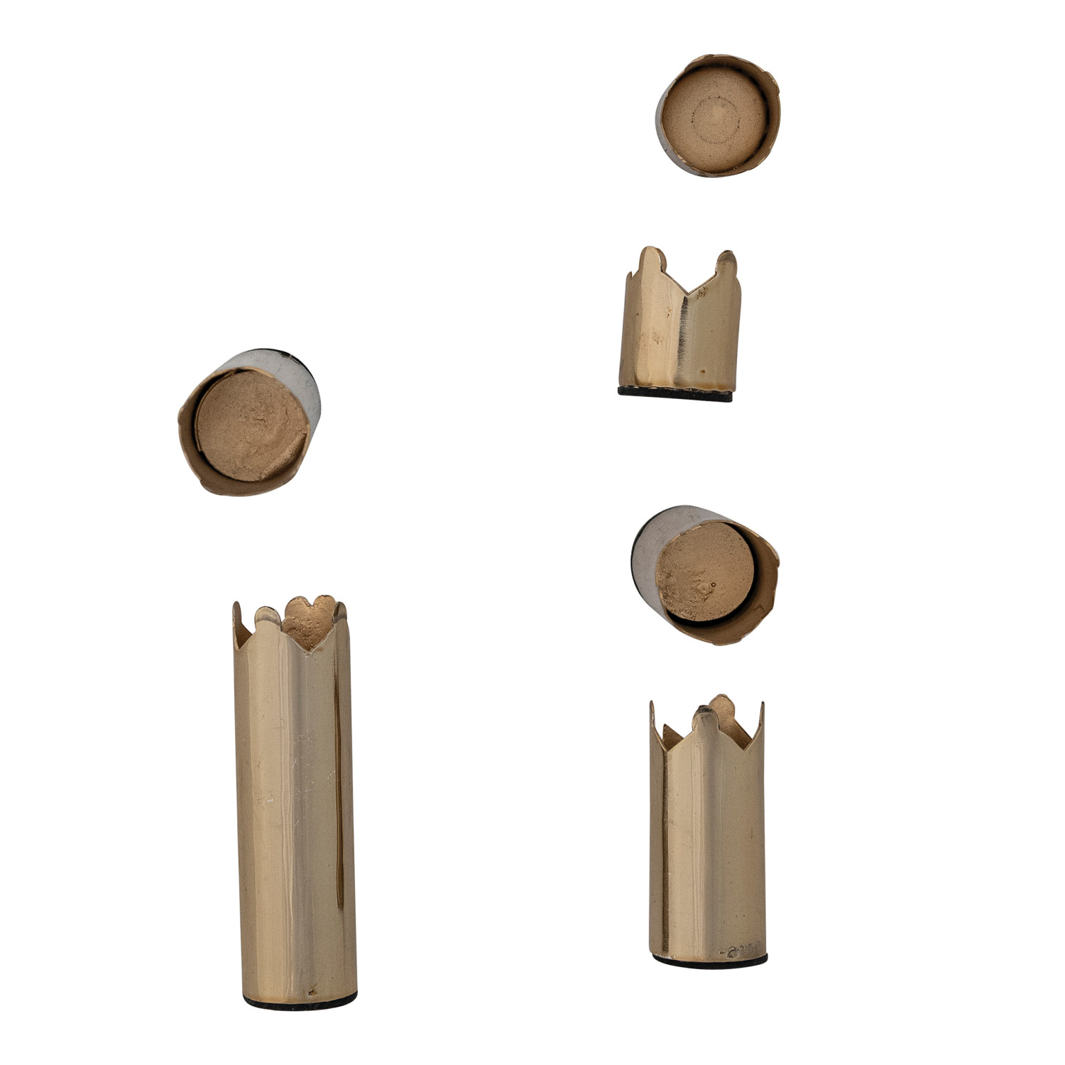Catalog Name: (2) 3"H, (2) 2"H & (2) 1-1/4"H Metal Magnetic Crown Shaped Taper Holders, Gold Finish, Boxed Set of 6