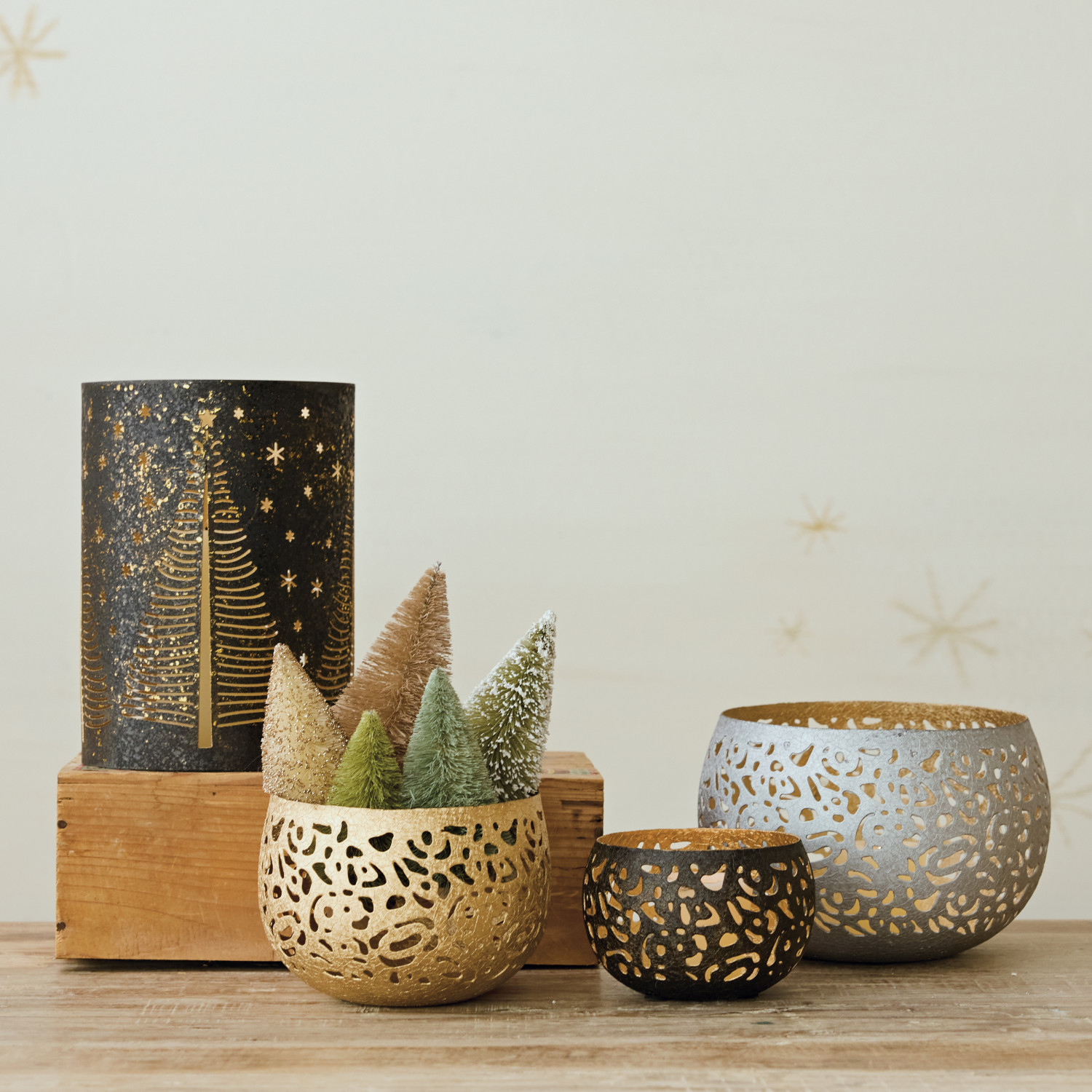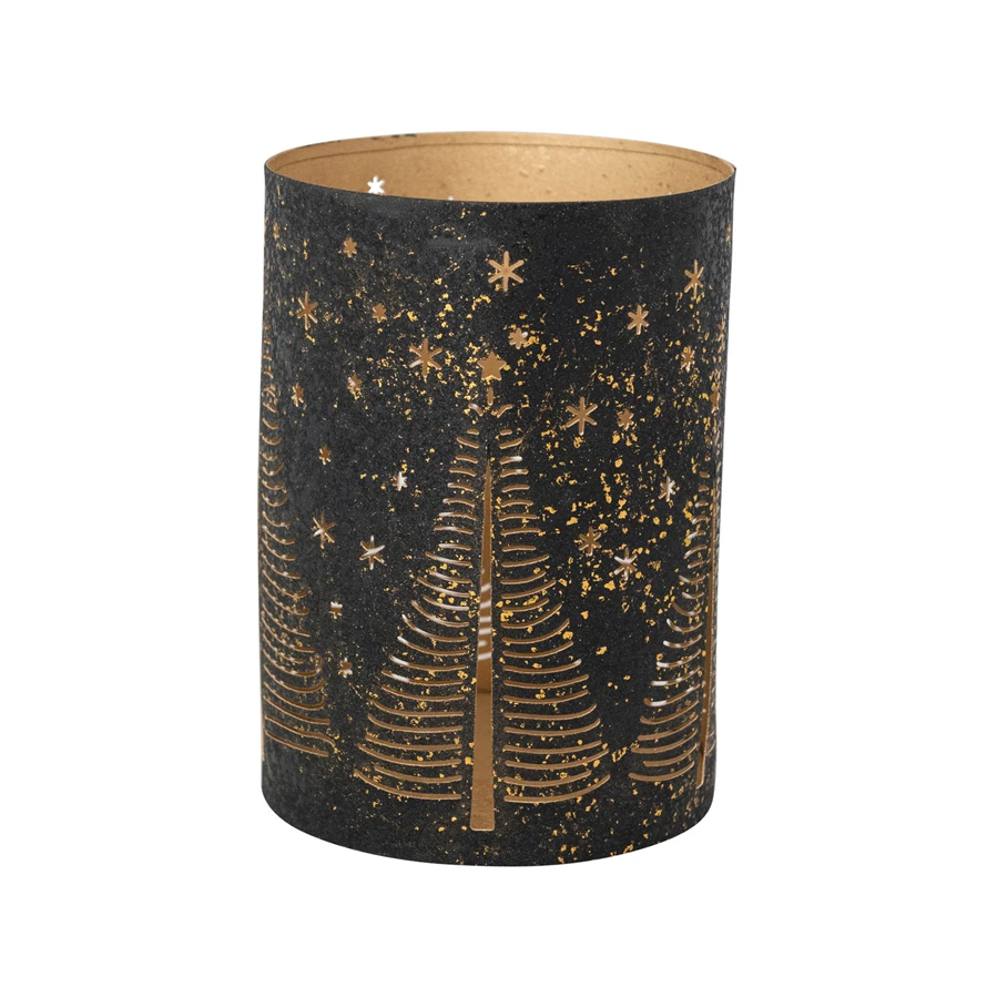 Textured Metal Hurricane with Laser Cut Stars & Trees, Black & Gold Finish