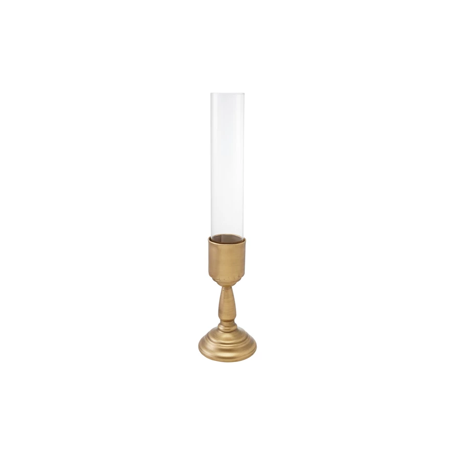 Catalog Name: 4-1/4" Round x 18-1/4"H Metal Taper Holder w/ Glass Hurricane, Gold Finish, Set of 2