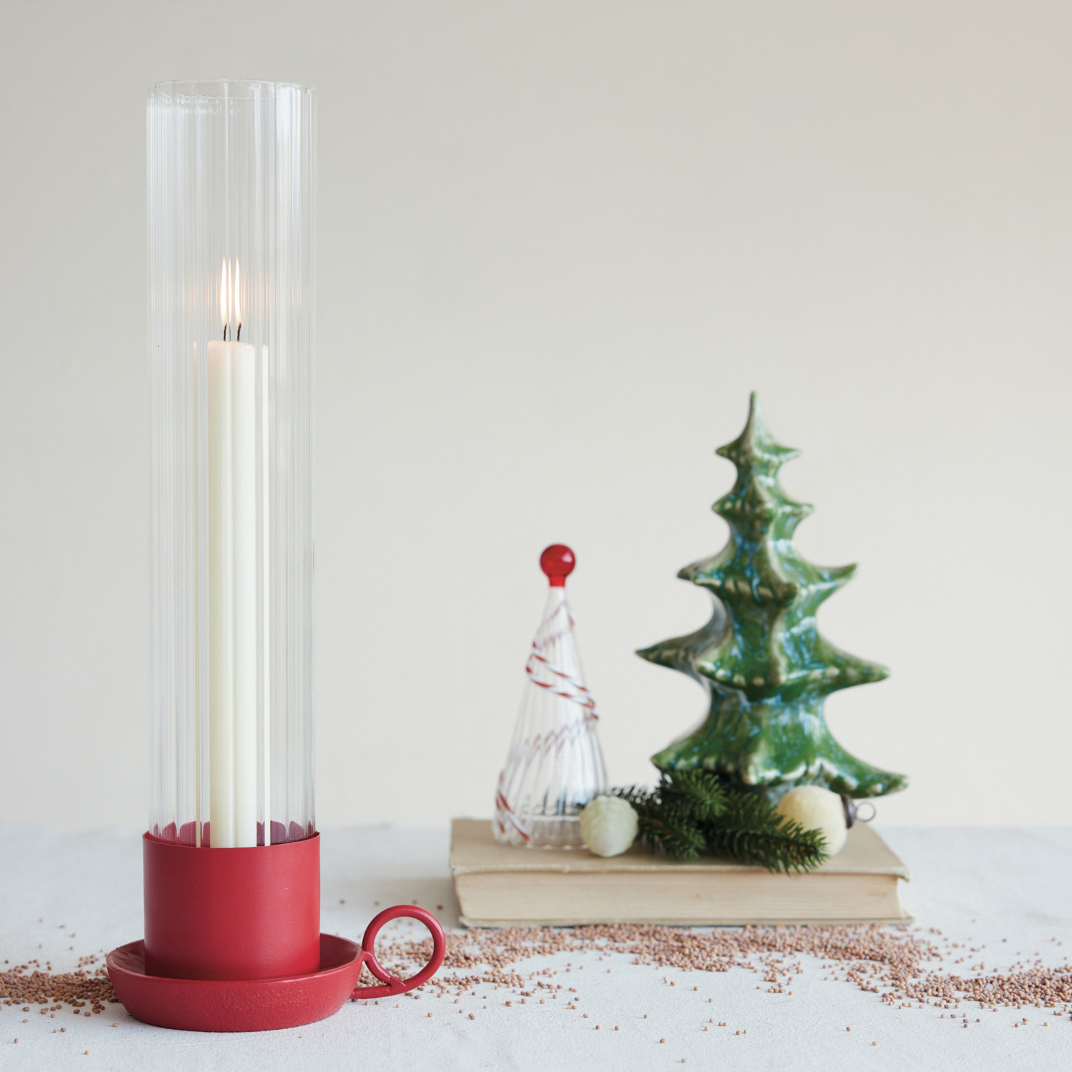 Metal Taper Holder with Ribbed Glass Hurricane & Handle, Matte Red, Set of 2