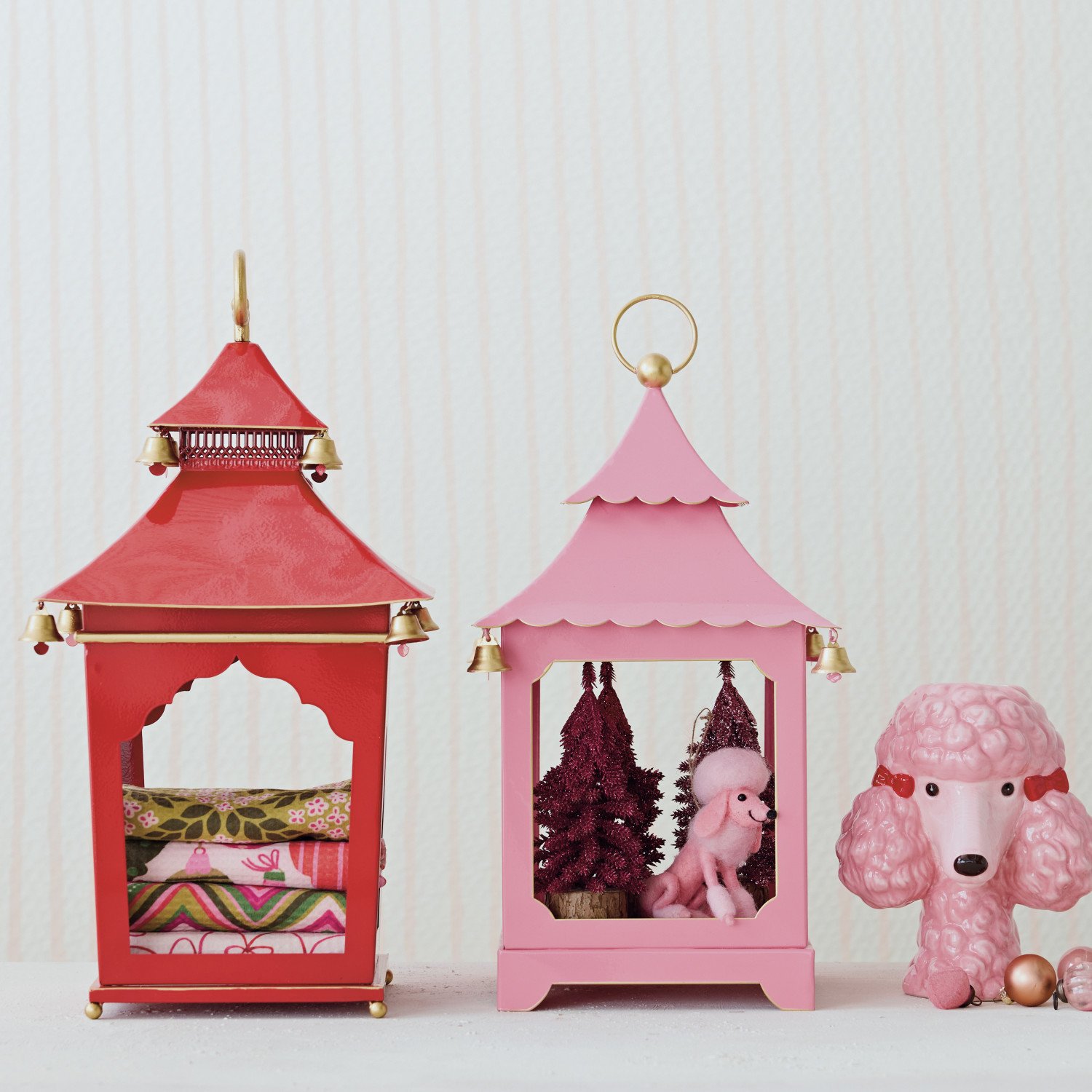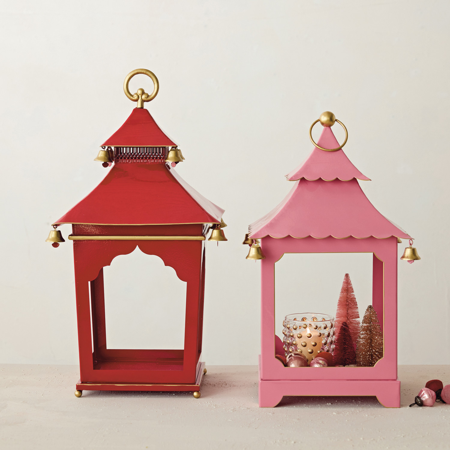 Catalog Name: 9-1/2" Square x 17-1/4"H Metal Scalloped Lantern w/ Bells & Handle, Pink & Gold Finish