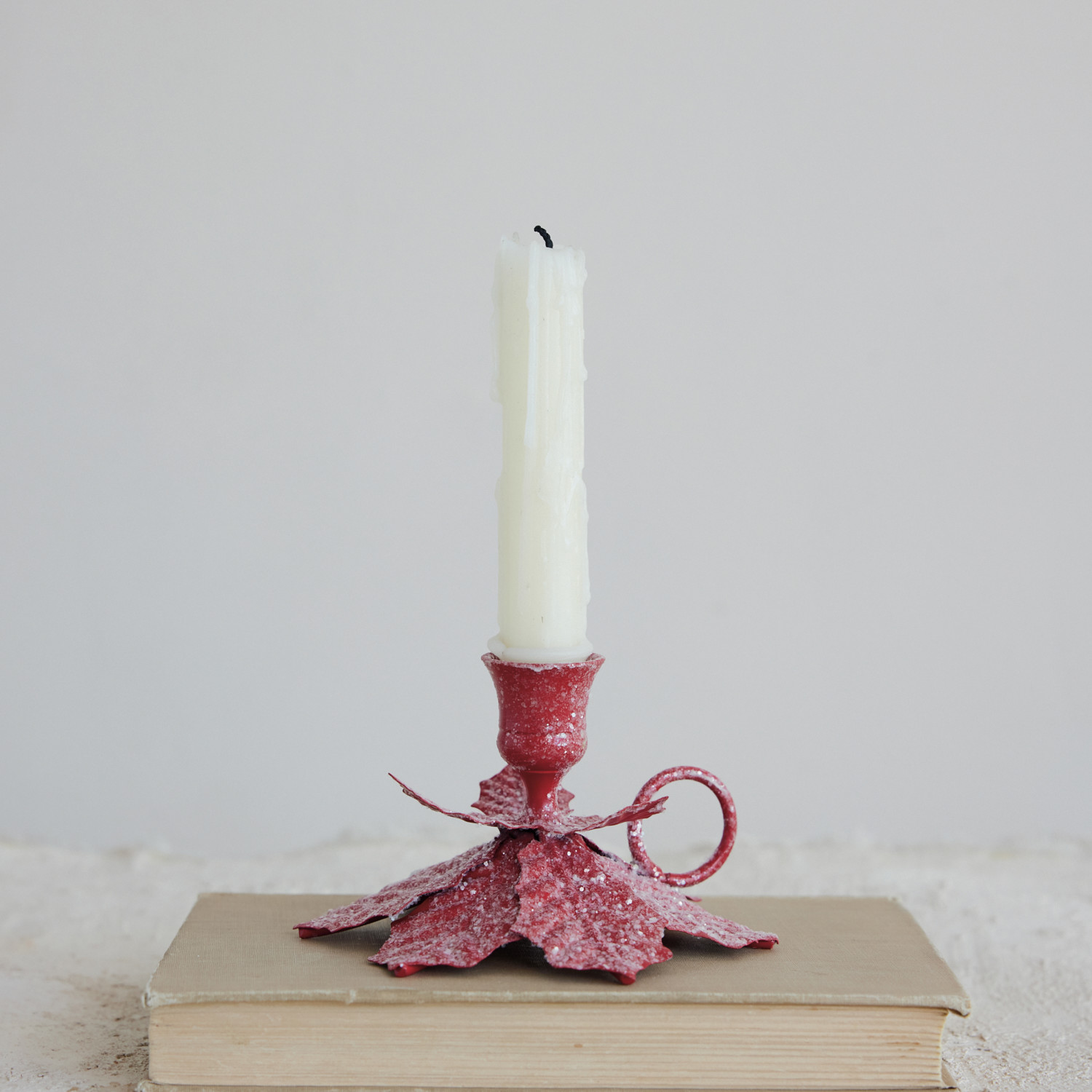 Metal Poinsettia Shaped Taper Holder with Handle & Sugar, Red