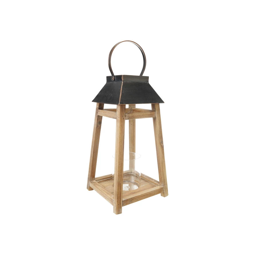 Catalog Name: 8-1/4" Square x 16"H Wood & Metal Lantern w/ Glass Hurricane, Natural & Black, Truck Ship