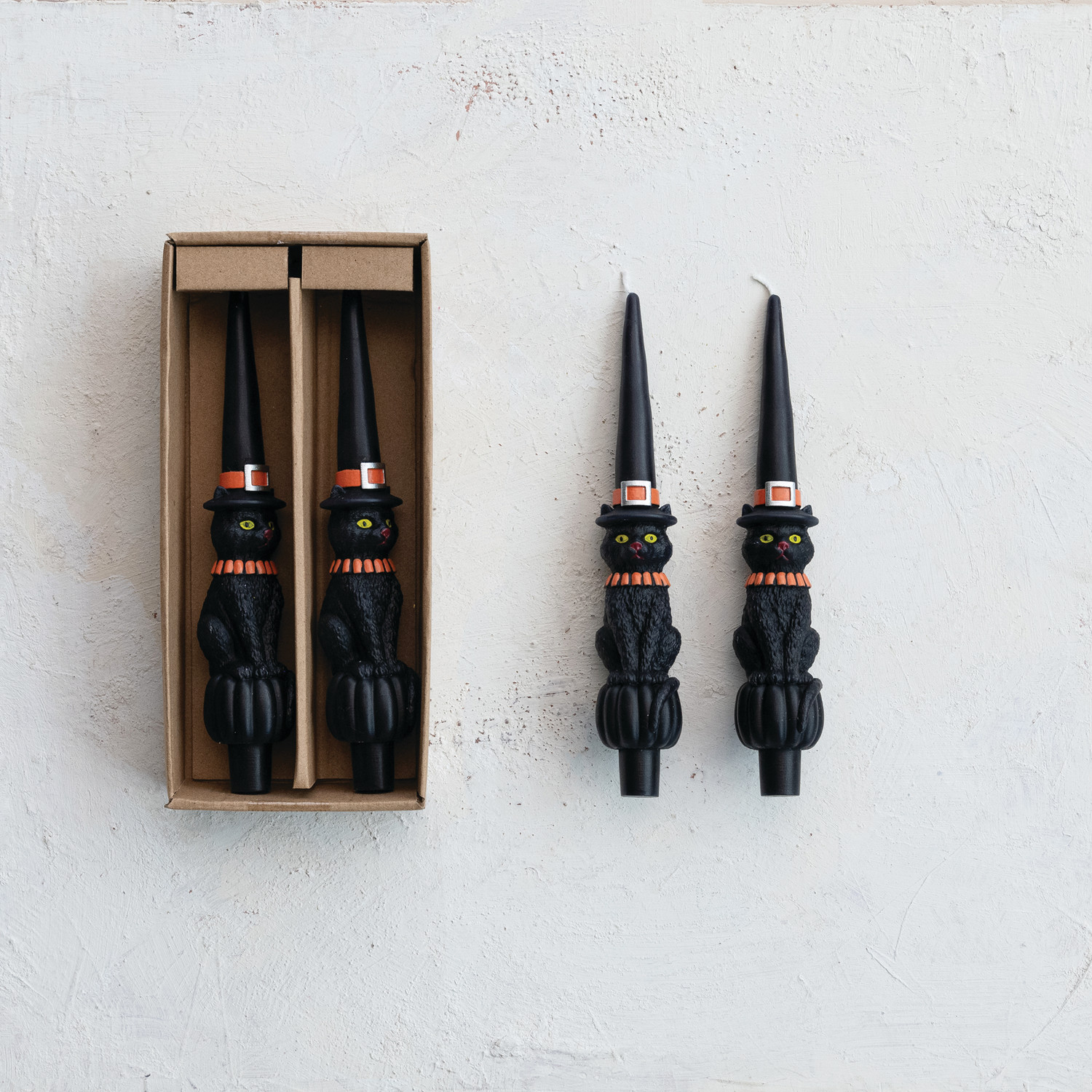 Catalog Name: 10"H Unscented Cat w/ Witch Hat Shaped Taper Candles in Box, Black & Orange Color, Set of 2 (Est. Burn Time 7 Hours)