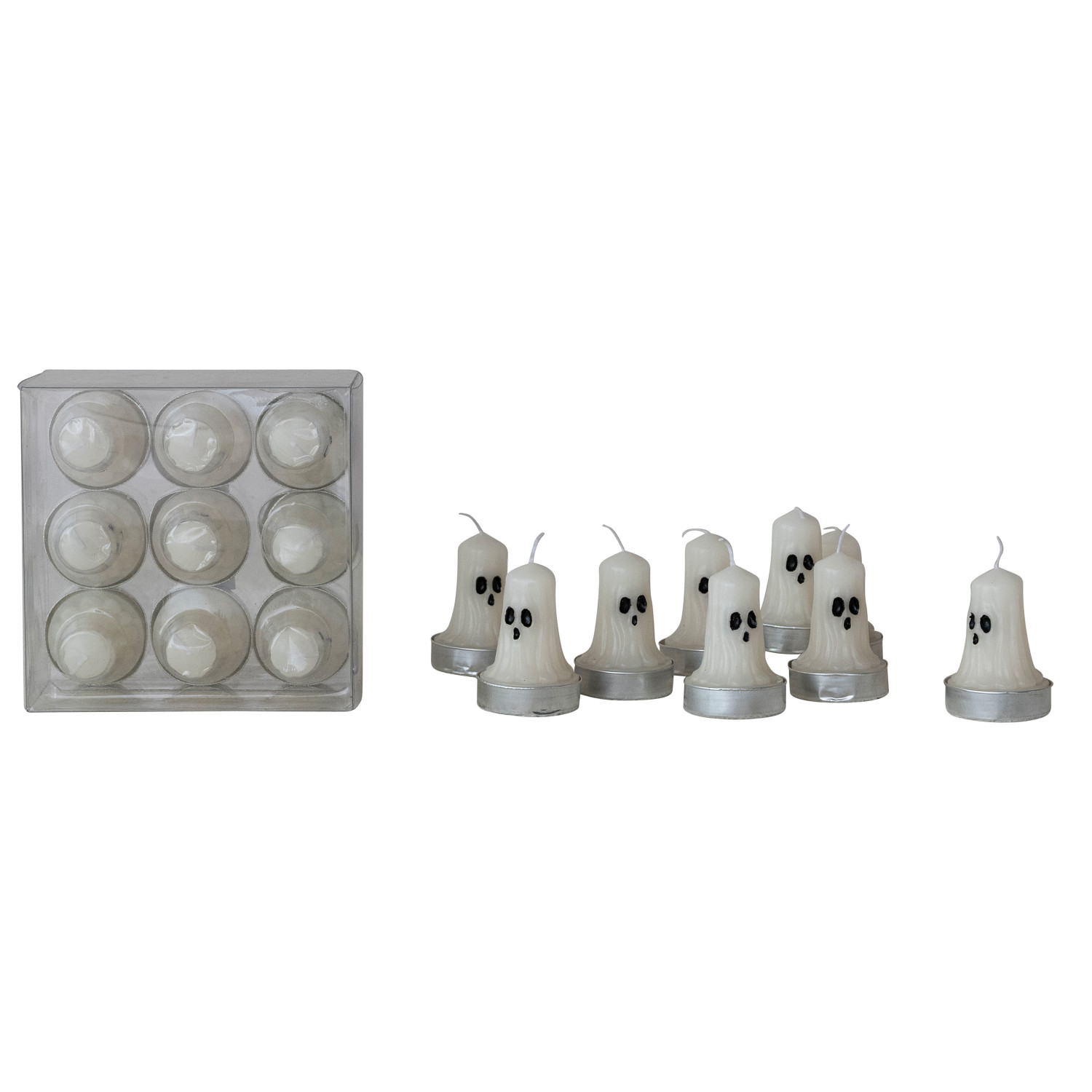 Catalog Name: 1-1/2" Round Unscented Ghost Shaped Tealights in Box, White & Black, Set of 9 (Est. Burn Time 3-1/2 Hours)