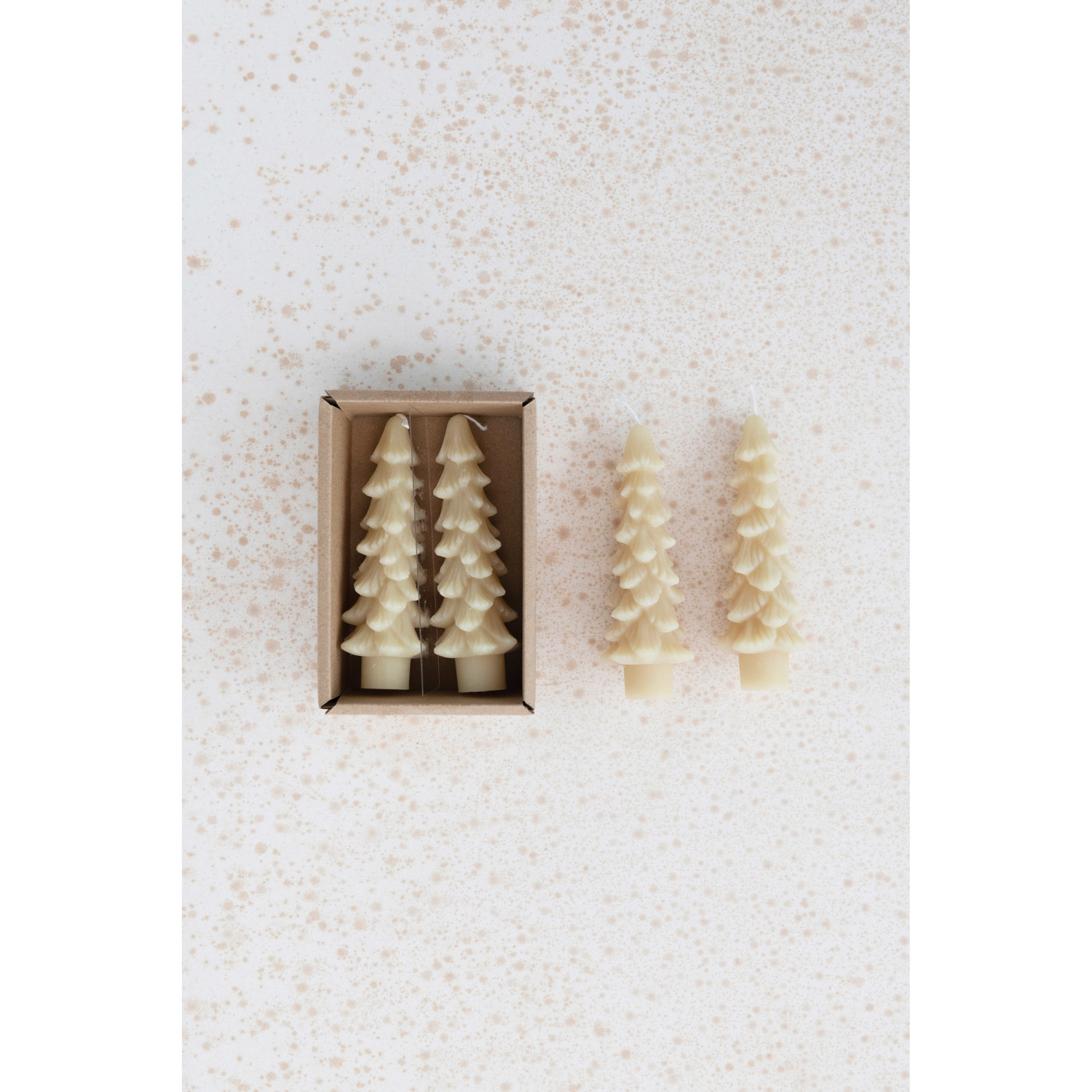 Catalog Name: 5"H Unscented Tree Shaped Taper Candles in Box, Eggnog Color, Set of 2 (Est. Burn Time 5 Hours)