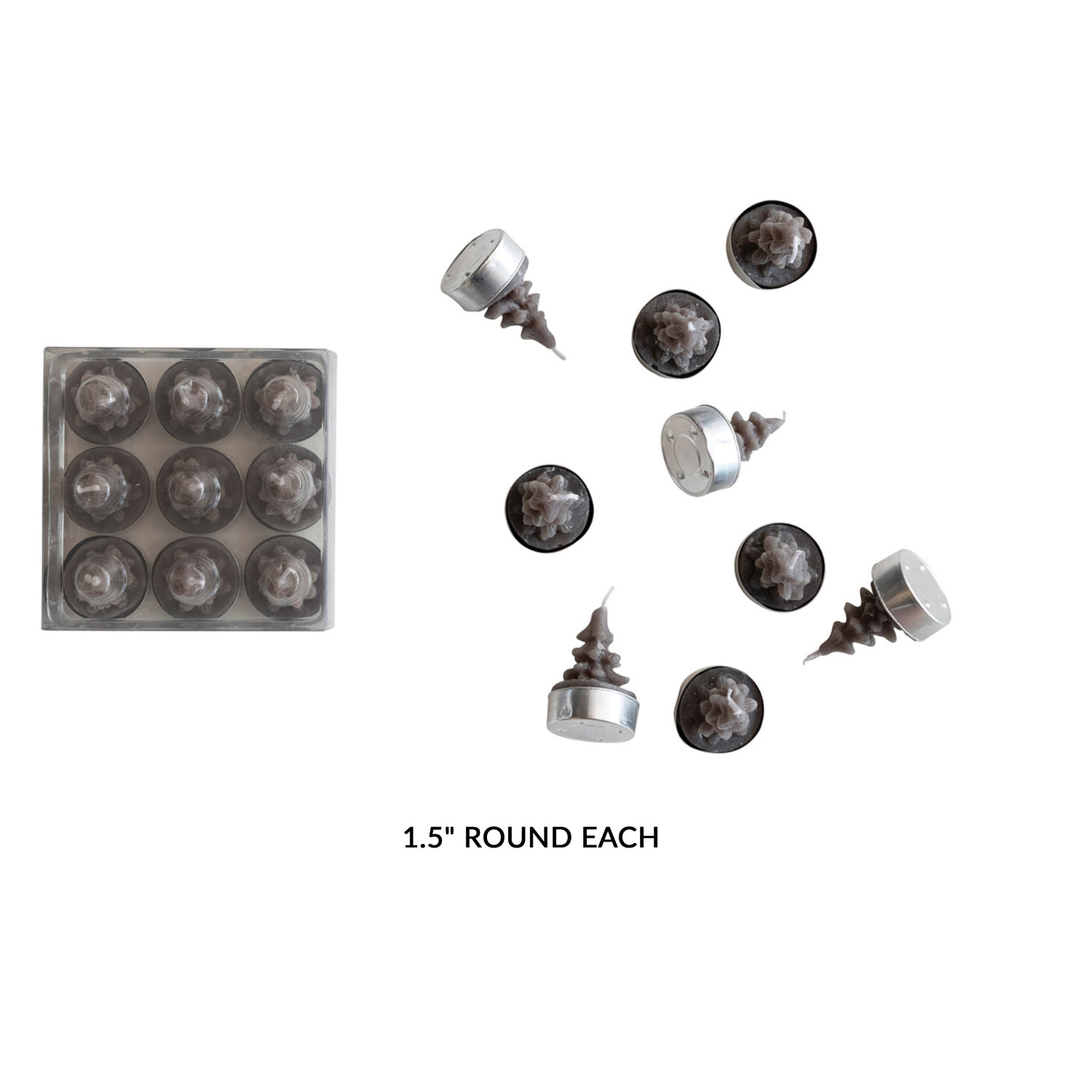 Add a whimsical ambiance to holiday gatherings with this enchanted tealight candle set. These unscented, tree-shaped candles come in a box of nine, each ready to illuminate the space with a soft, flickering light. Available in taupe and various colors, they can add a personalized touch to the decor. With a burn time of approximately 3 hours per tealight, they're just right for dinner parties or intimate evenings. Crafted from wax with cotton wicks, these tealights measure 1.5 inches round by 2.0 inches high, offering a charming and magical addition to any celebration. From adding a warm glow to gatherings to creating a calming atmosphere, this decorative candle adds a touch of magic to any space. A delightful set of tree-shaped tealights, each casting a serene glow in taupe and a variety of enchanting colors. Unscented candle for a clean and pure burn. Approximate burn time of 3 hours.