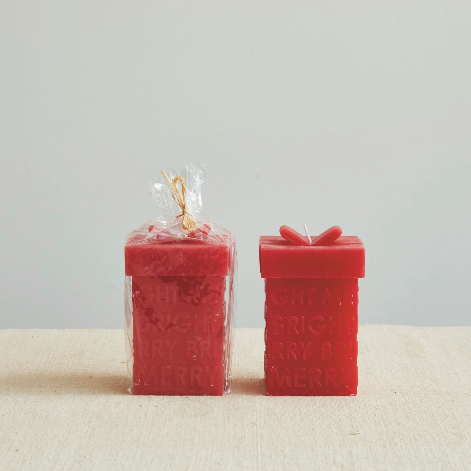 Catalog Name: 3-1/2" Square x 5-1/2"H Unscented Gift Box Shaped Candle "Merry/Bright", Red (Approximate Burn Time 75 Hours)