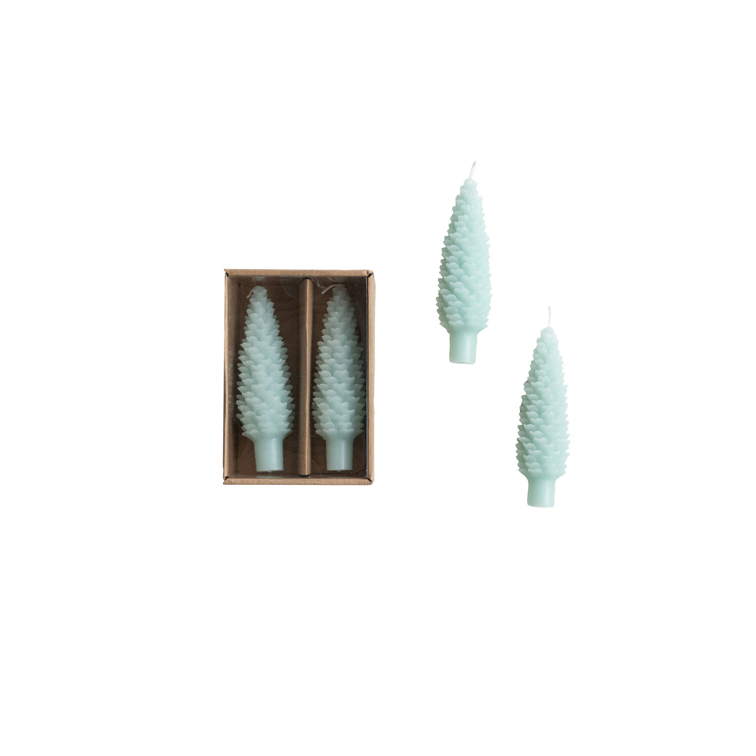 Catalog Name: 5-3/4"H Unscented Pinecone Shaped Taper Candles in Box, Mint Blue, Set of 2 (Est. Burn Time 6 Hours)