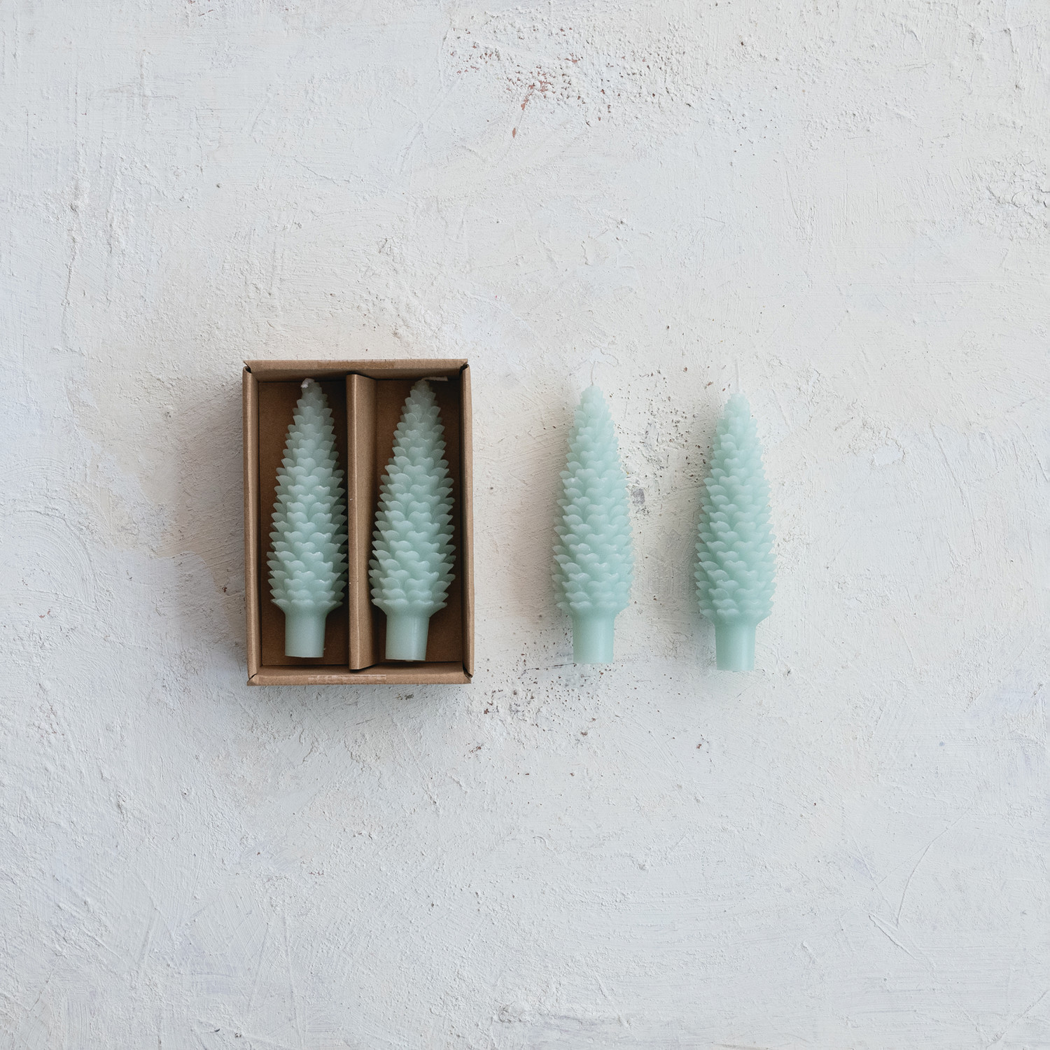 Unscented Pinecone Shaped Taper Candles in Box, Mint Blue, Set of 2
