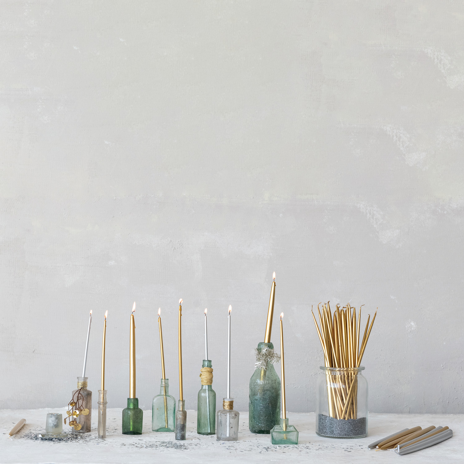 Catalog Name: Approx. 1/2" Round x 10"H Unscented Thin Taper Candles in Box, Gold Color, Set of 24 (Est. Burn Time 3-1/2 Hours)