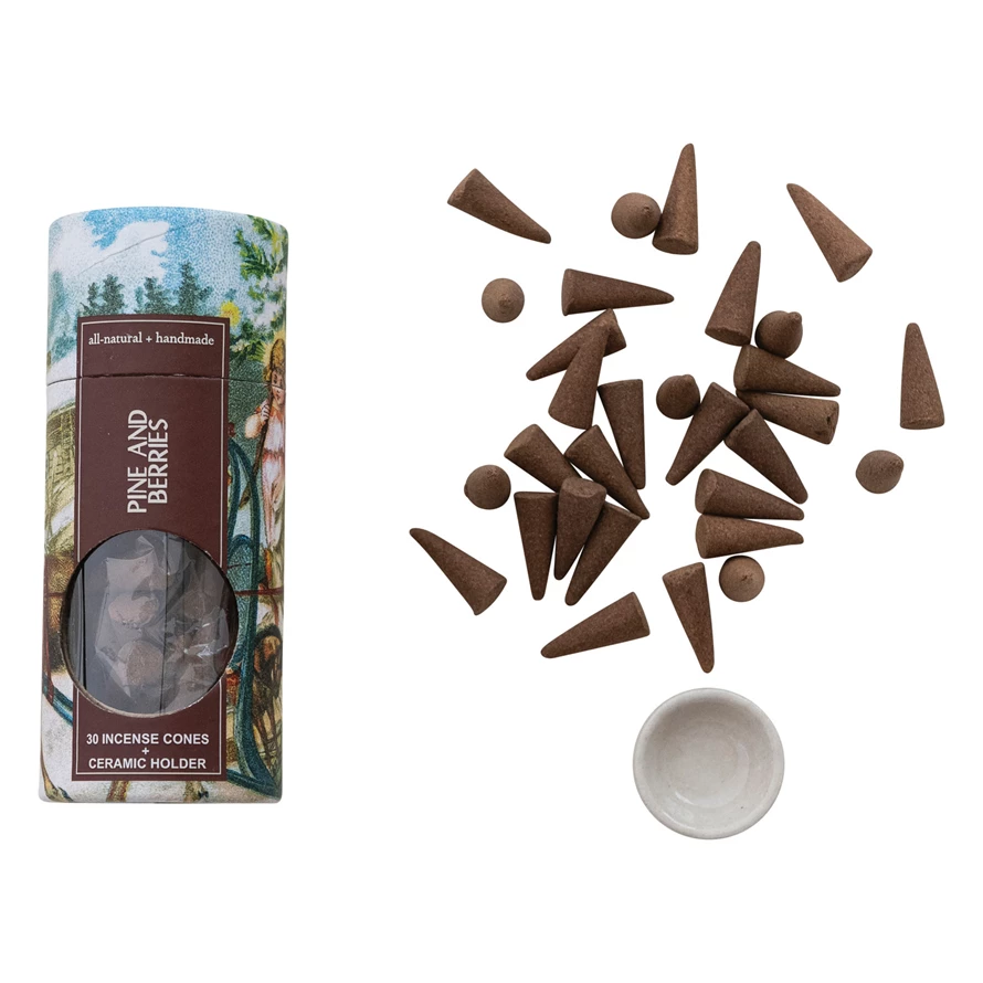 30 Piece All Natural Pine & Berries Scented Incense Cones with Incense Holder, Set of 31