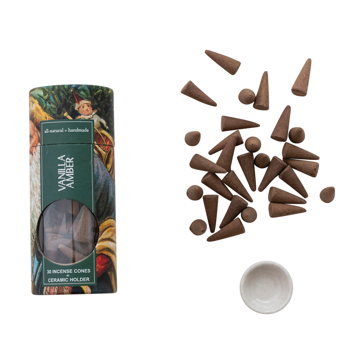 30 Piece All Natural Vanilla Amber Scented Incense Cones with Incense Holder, Set of 31
