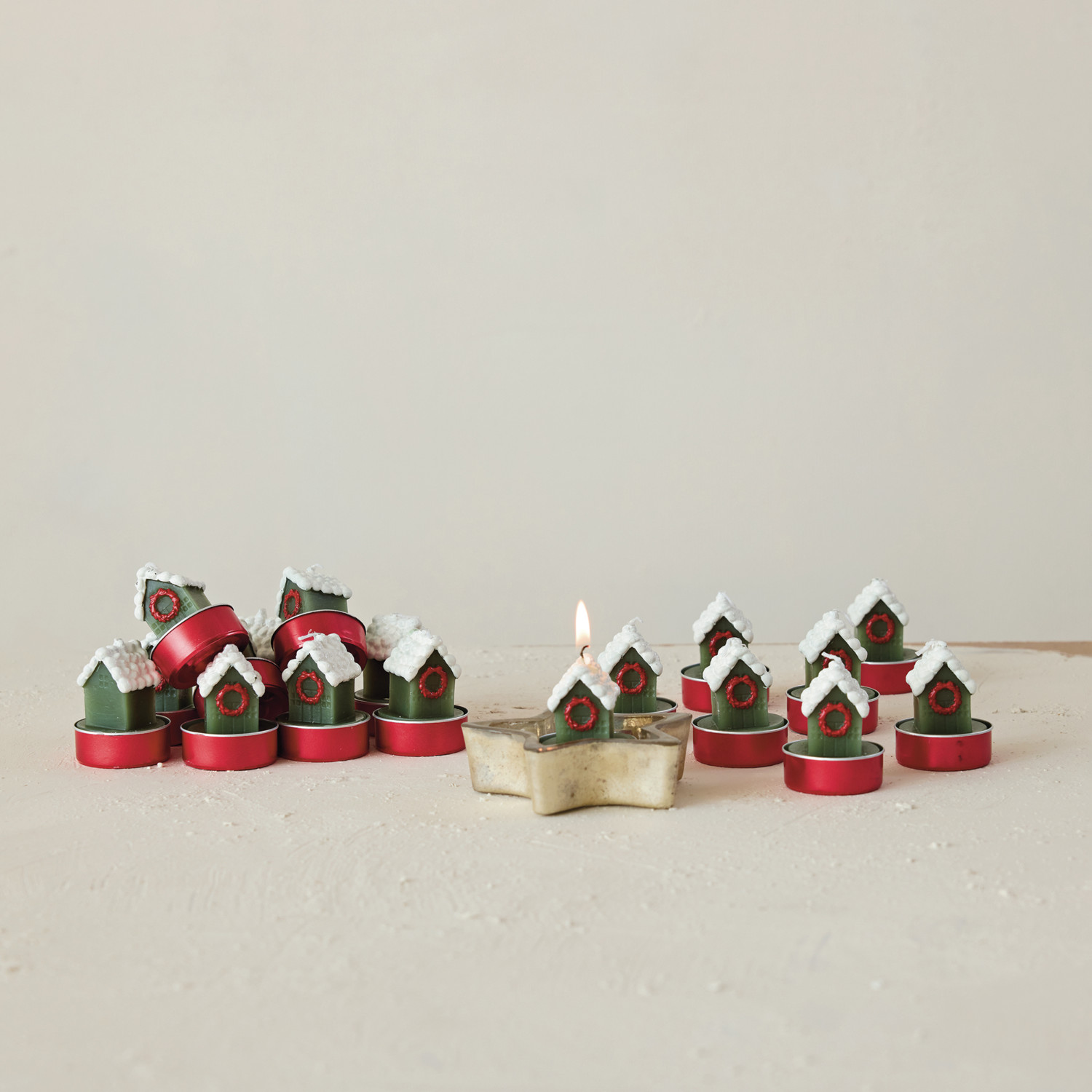 Catalog Name: 1-3/4"H Unscented House w/ Snow & Wreath Shaped Tealights in Box, White, Green & Red, Set of 9 (Est. Burn Time 4 Hours)