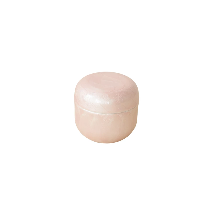 Catalog Name: 4" Round x 3-3/4"H 9.5 oz. Enameled Metal Winter Berry Scented Jar Candle w/ Lid, Pearlized Finish, Pink