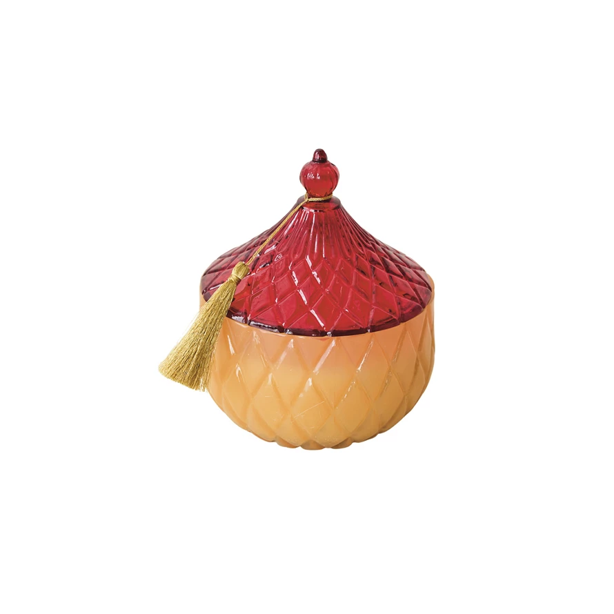 Catalog Name: 5-3/4" Round x 7-1/4"H 21.9 oz. Embossed Glass Laurel & Spice Scented Jar Candle w/ Lid & Gold Color Tassel, Red & Apricot Color