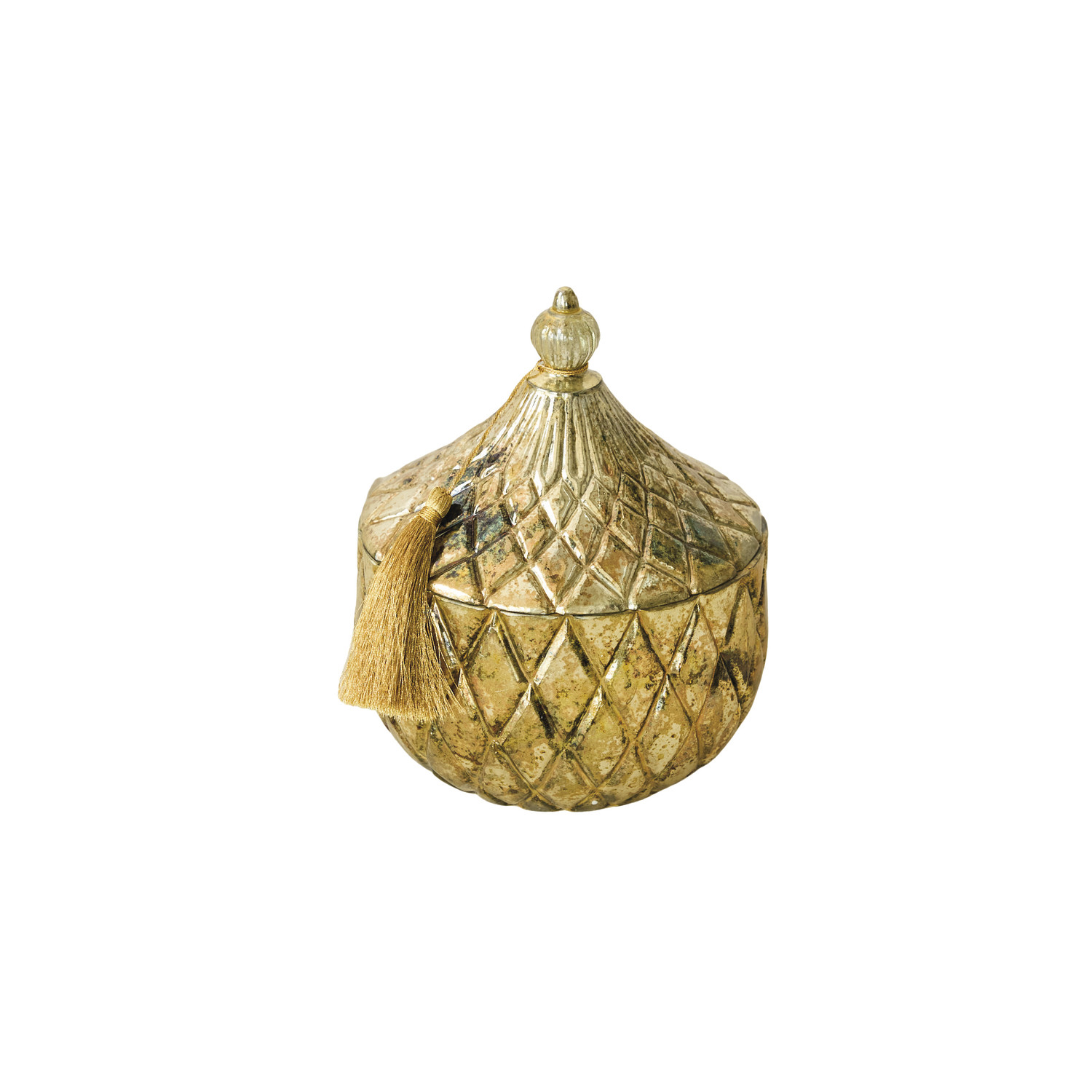 Catalog Name: 5-3/4" Round x 7-1/4"H 21.9 oz. Embossed Glass Frosted Woods Scented Jar Candle w/ Lid & Gold Color Tassel, Distressed Gold & Copper Finish