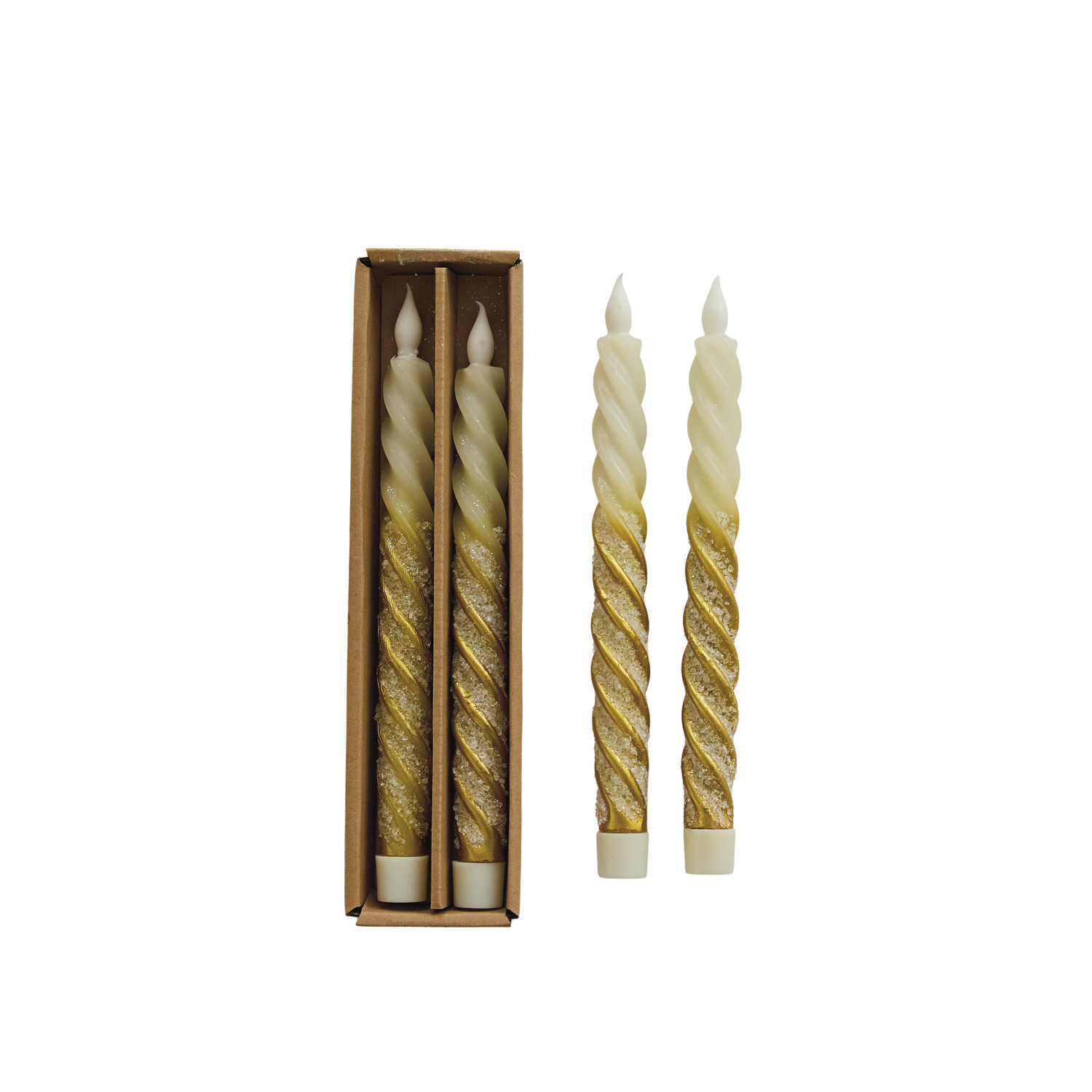Catalog Name: 9-3/4"H Flameless LED Two-Tone Twisted Taper Candles w/ 6 Hour Timer in Box, Gold & Cream Color w/ Sugar, Set of 2 (Requires 2-AA Batteries)
