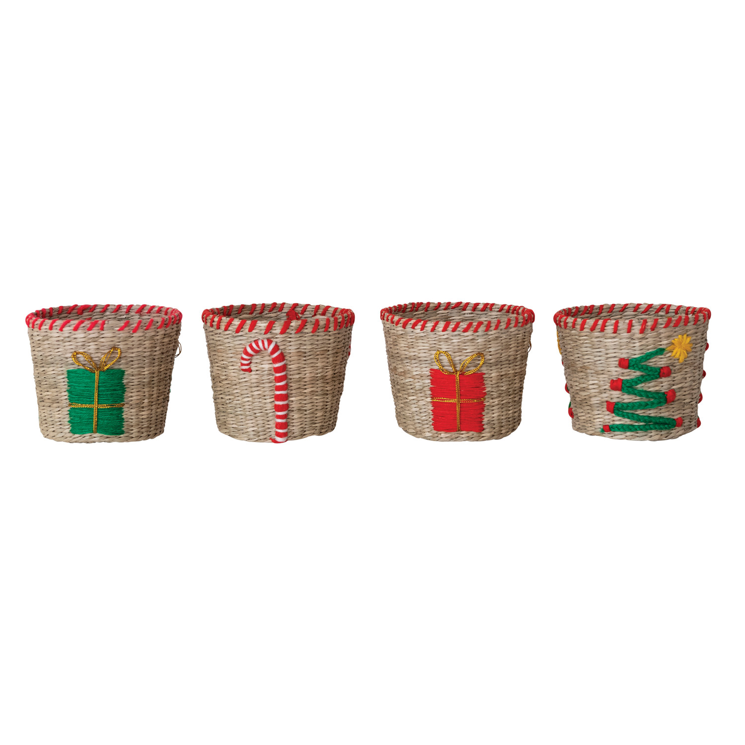 Catalog Name: 5" Round x 4"H Hand-Woven Seagrass & Cotton Basket w/ Embroidered Holiday Icon & Stitched Edge, Multi Color, 4 Styles (Each One Will Vary)