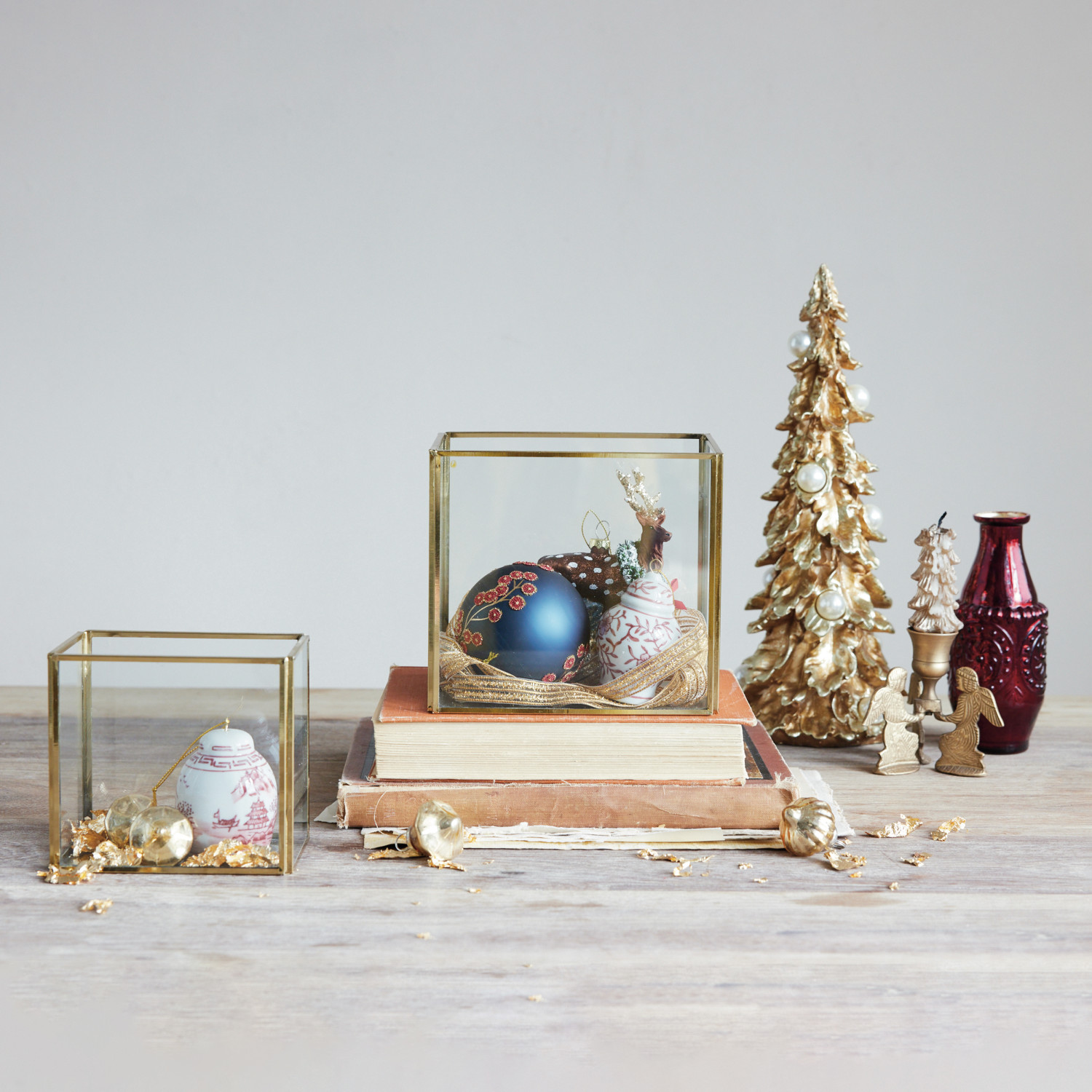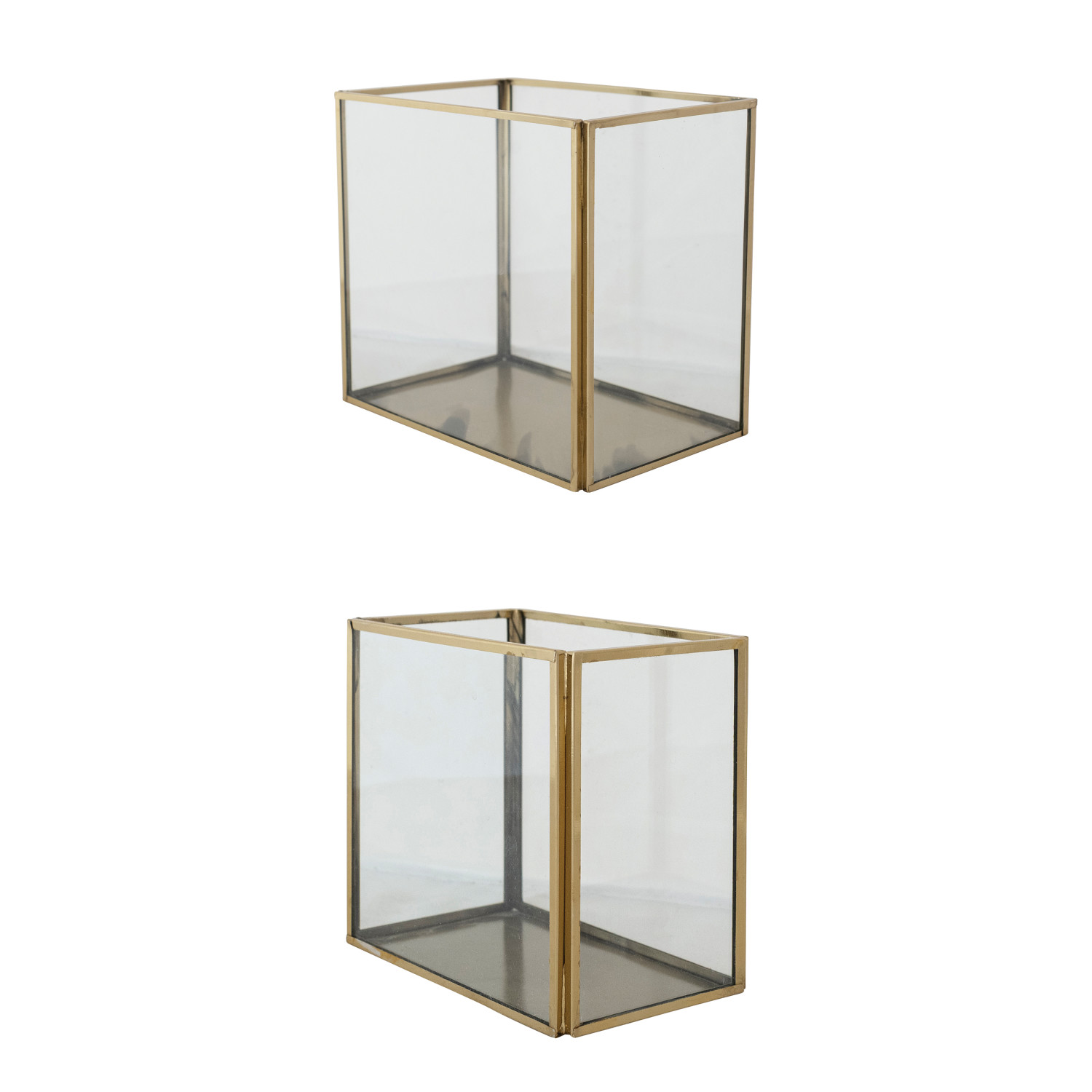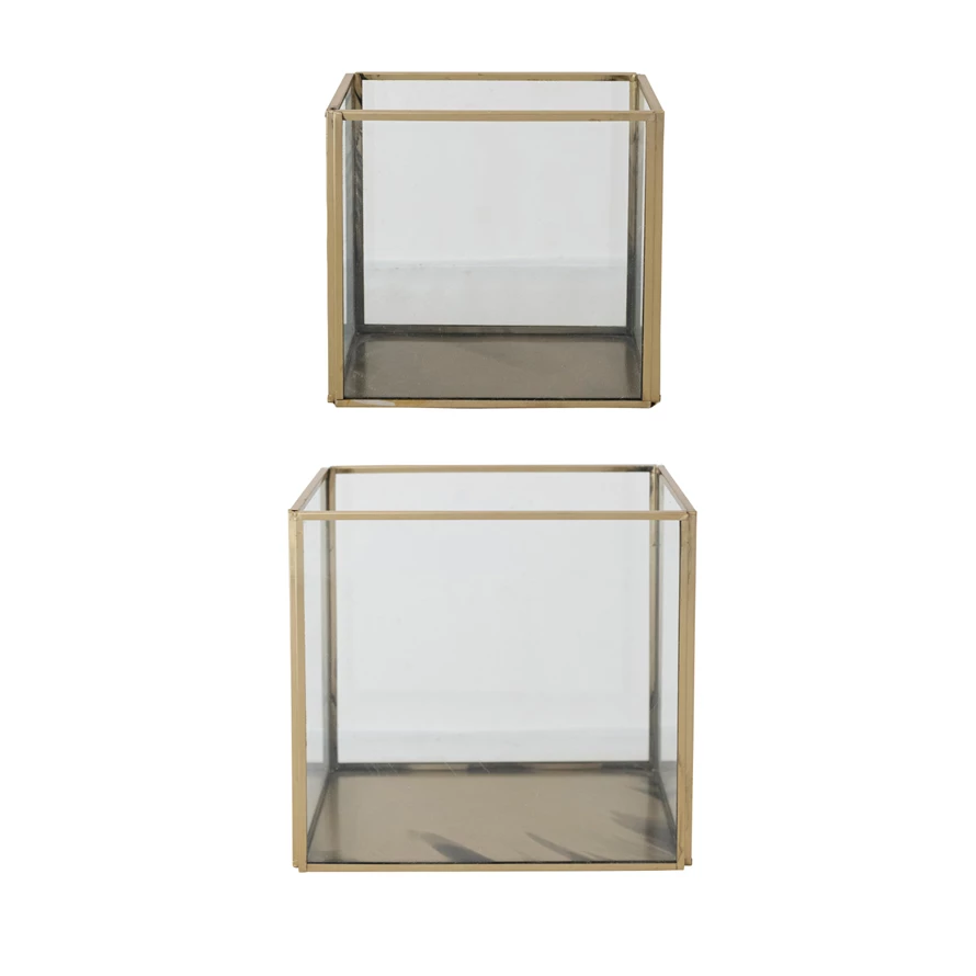 Catalog Name: 6-1/2"L x 4-1/4"W x 6"H & 5"L x 3"W x 4-1/2"H Brass & Glass Containers, Antique Gold Finish, Set of 2