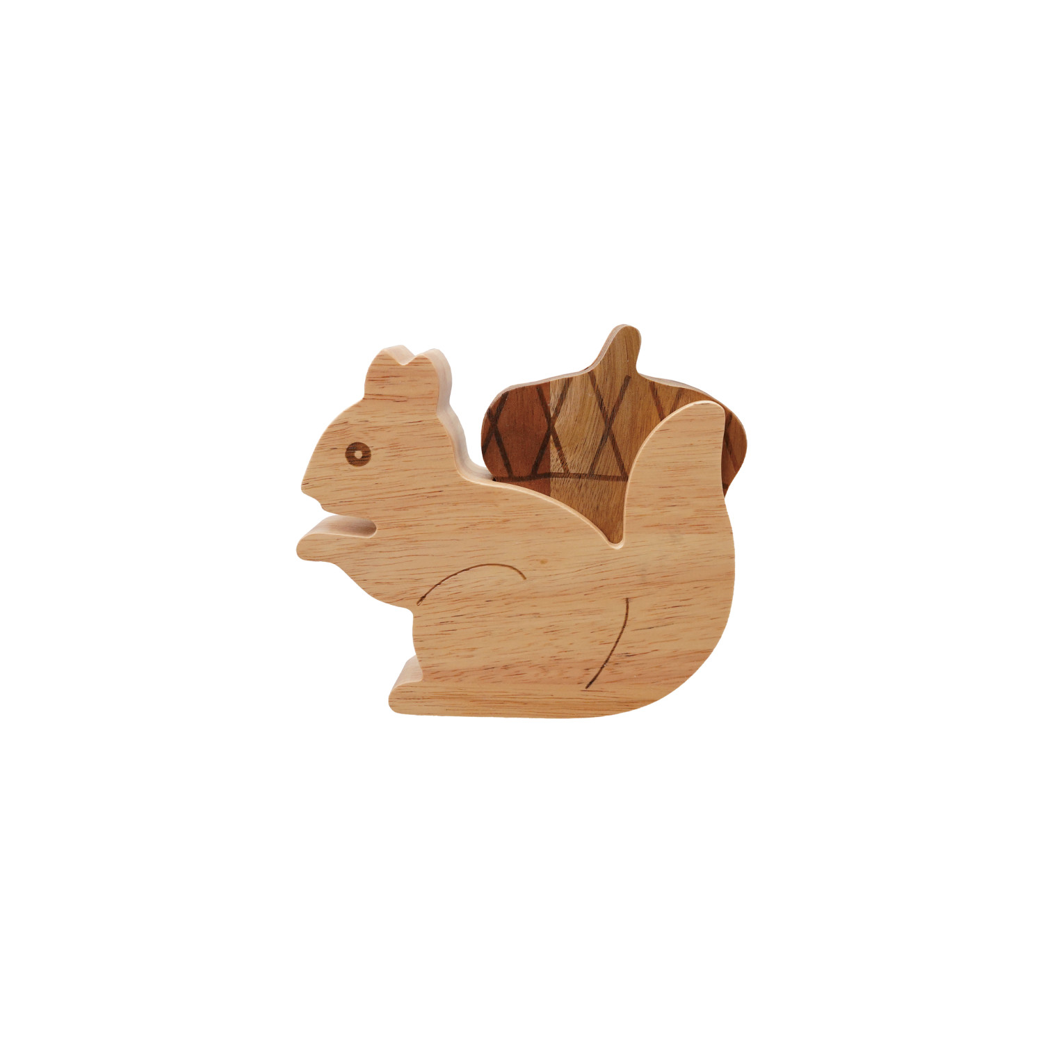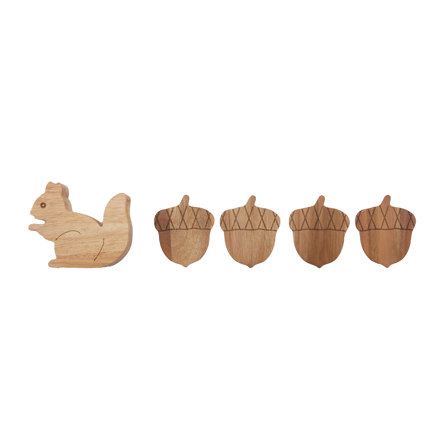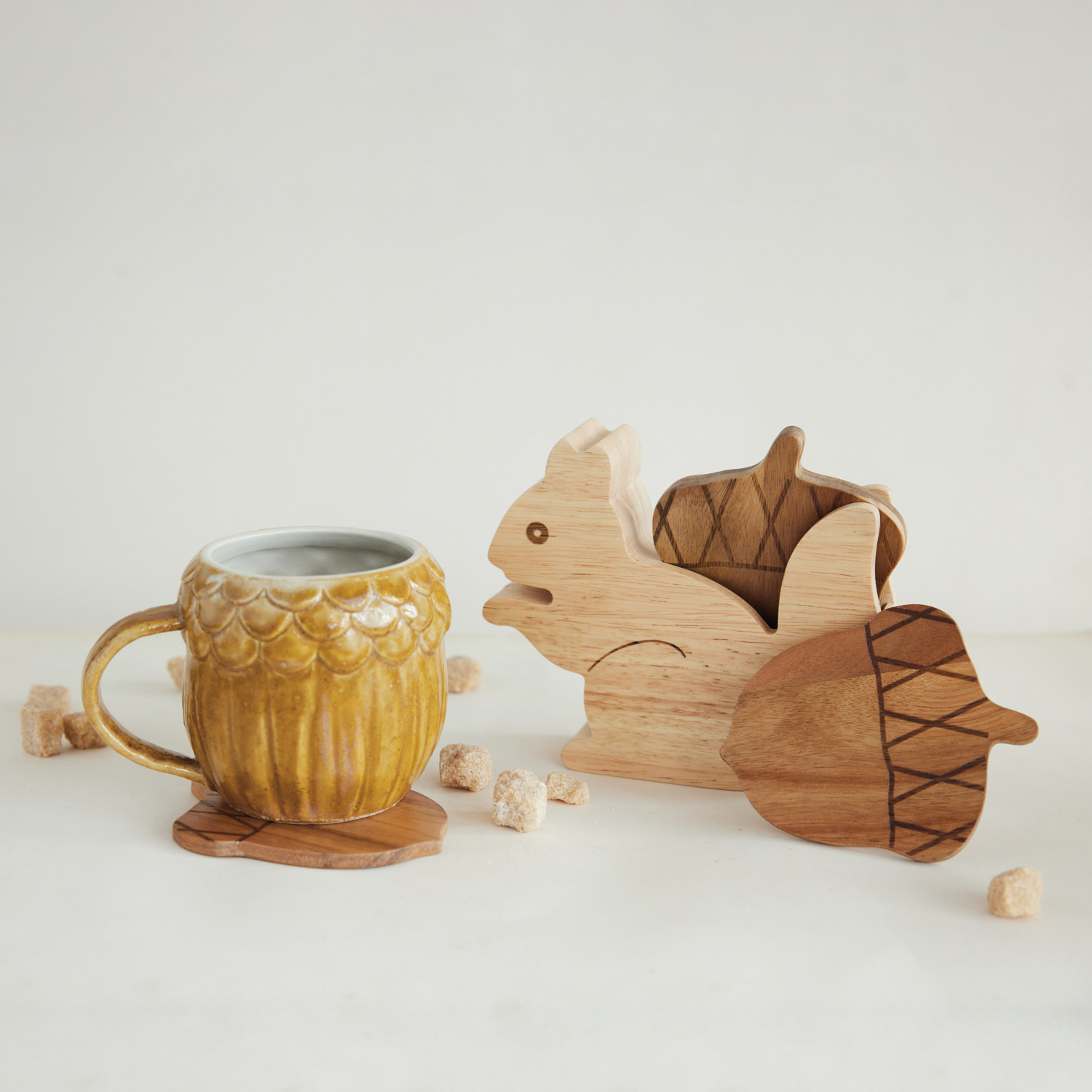 Rubberwood Acorn Shaped Coasters with Squirrel Shaped Holder, Set of 5