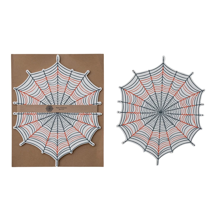 Catalog Name: 17"L x 13-1/2"W Handmade Recycled Paper Spider Web Shaped Single Use Placemats, Black, Orange Color & White, Set of 6