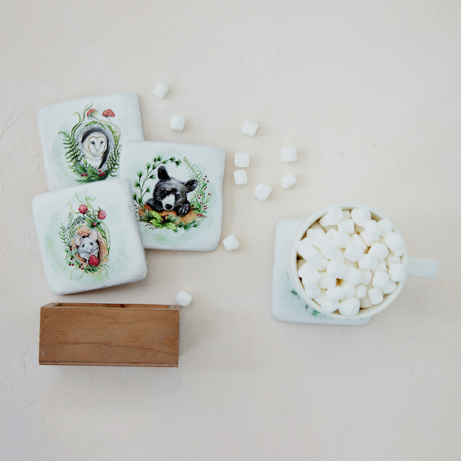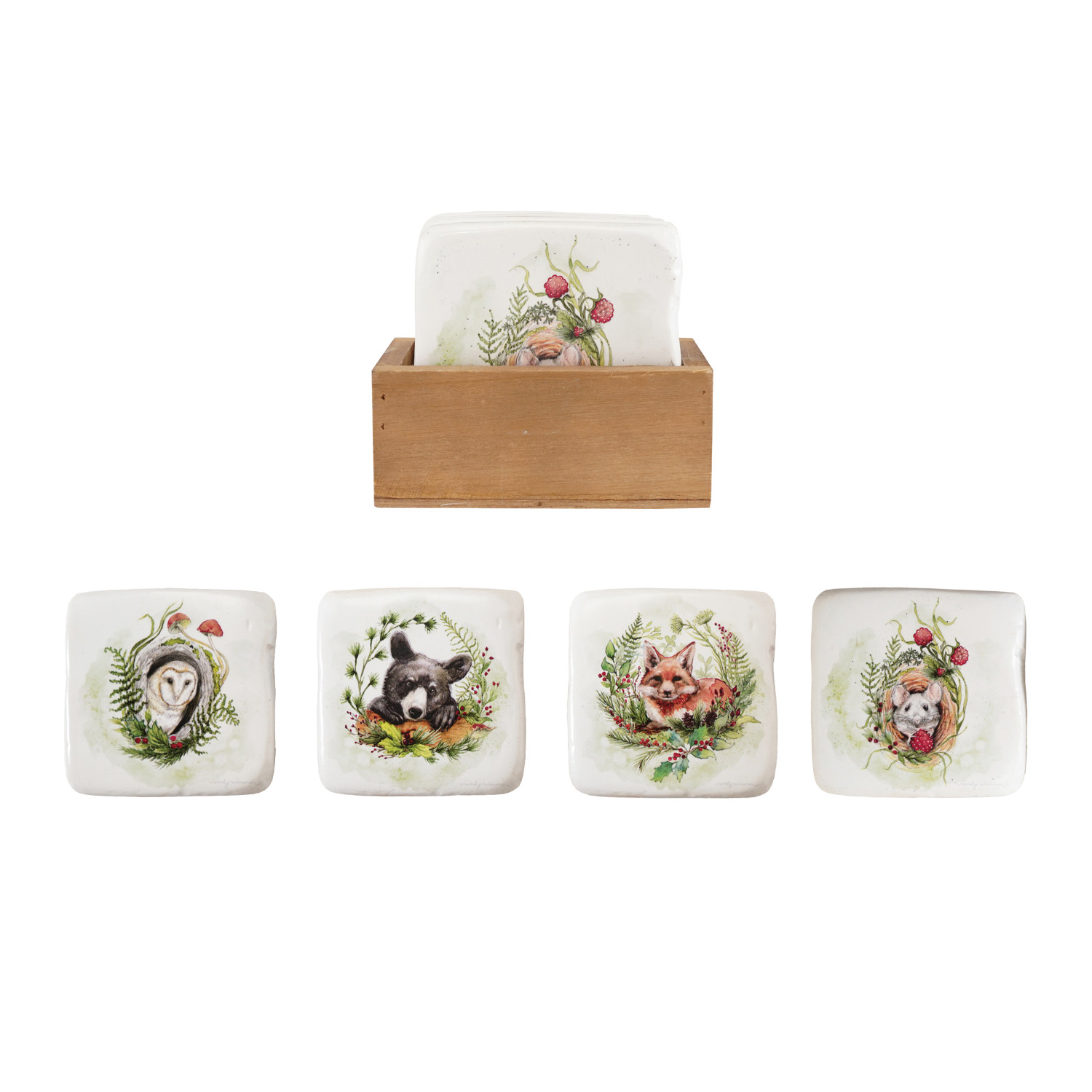 Resin Coasters with Woodland Animals & Seasonal Botanicals in Wood Box, Set of 5 ©