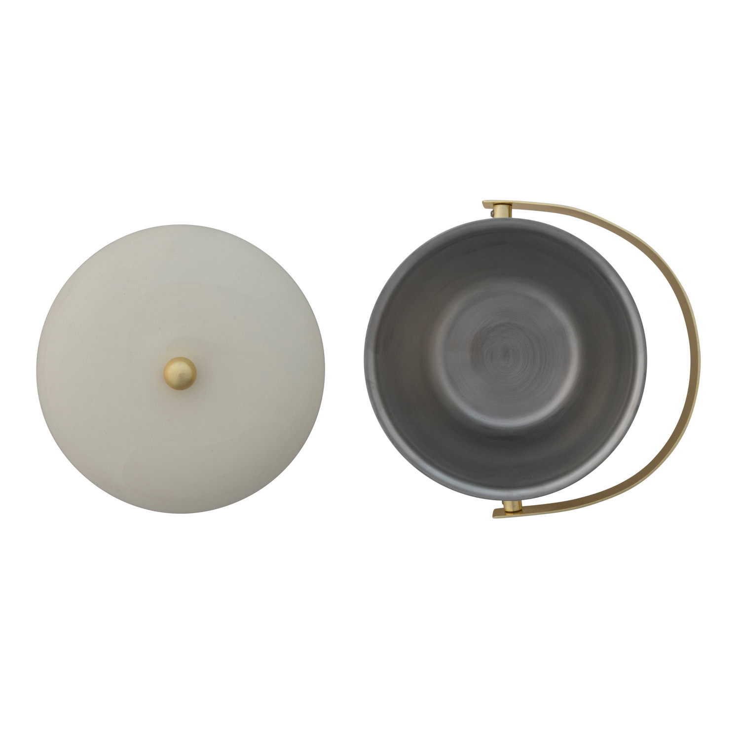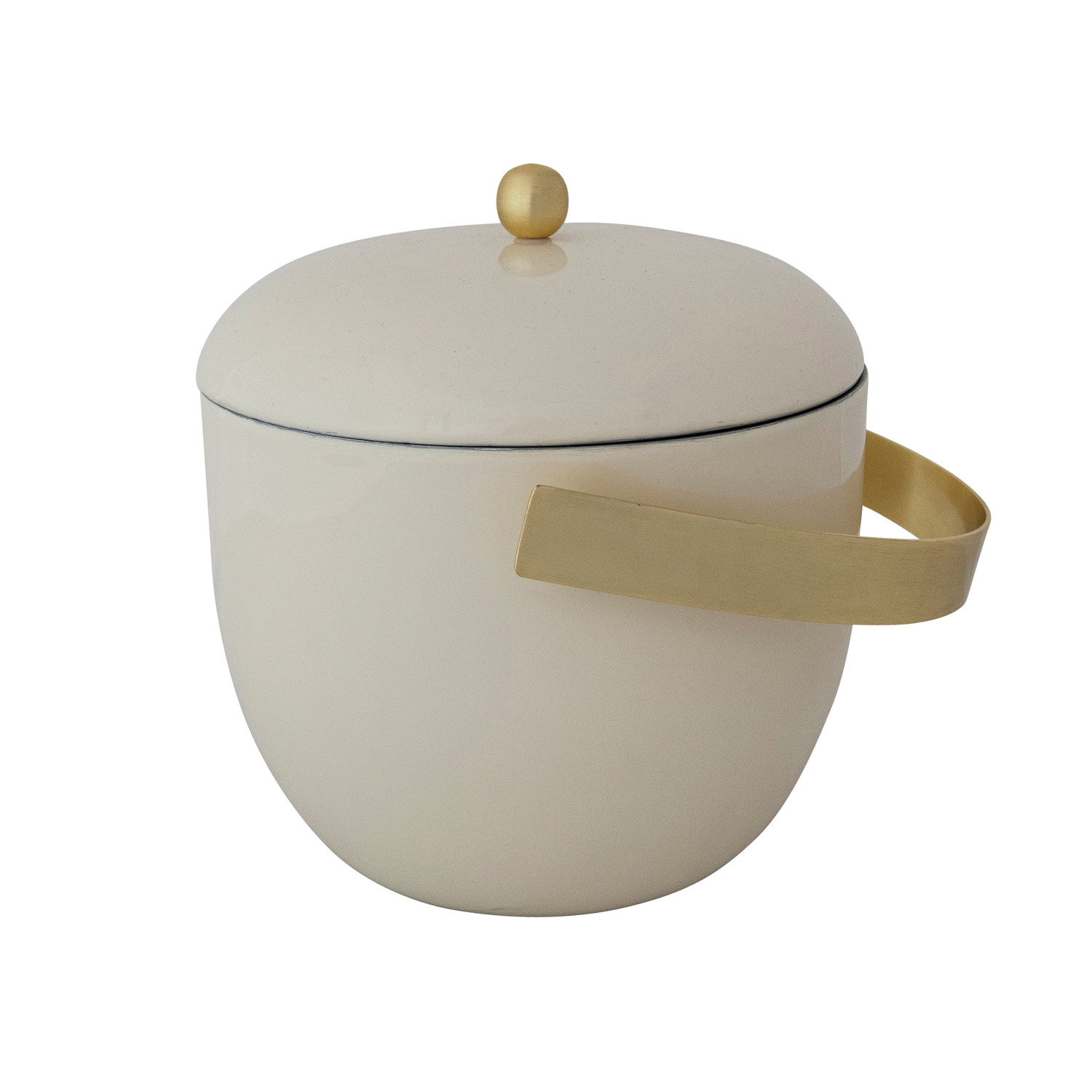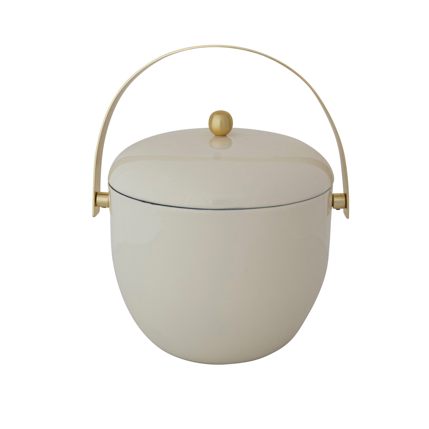 Catalog Name: 6-1/2" Round x 6-3/4"H 1-1/2 Quart Enameled Stainless Steel Ice Bucket w/ Gold Finish Knob & Handle, Cream Color