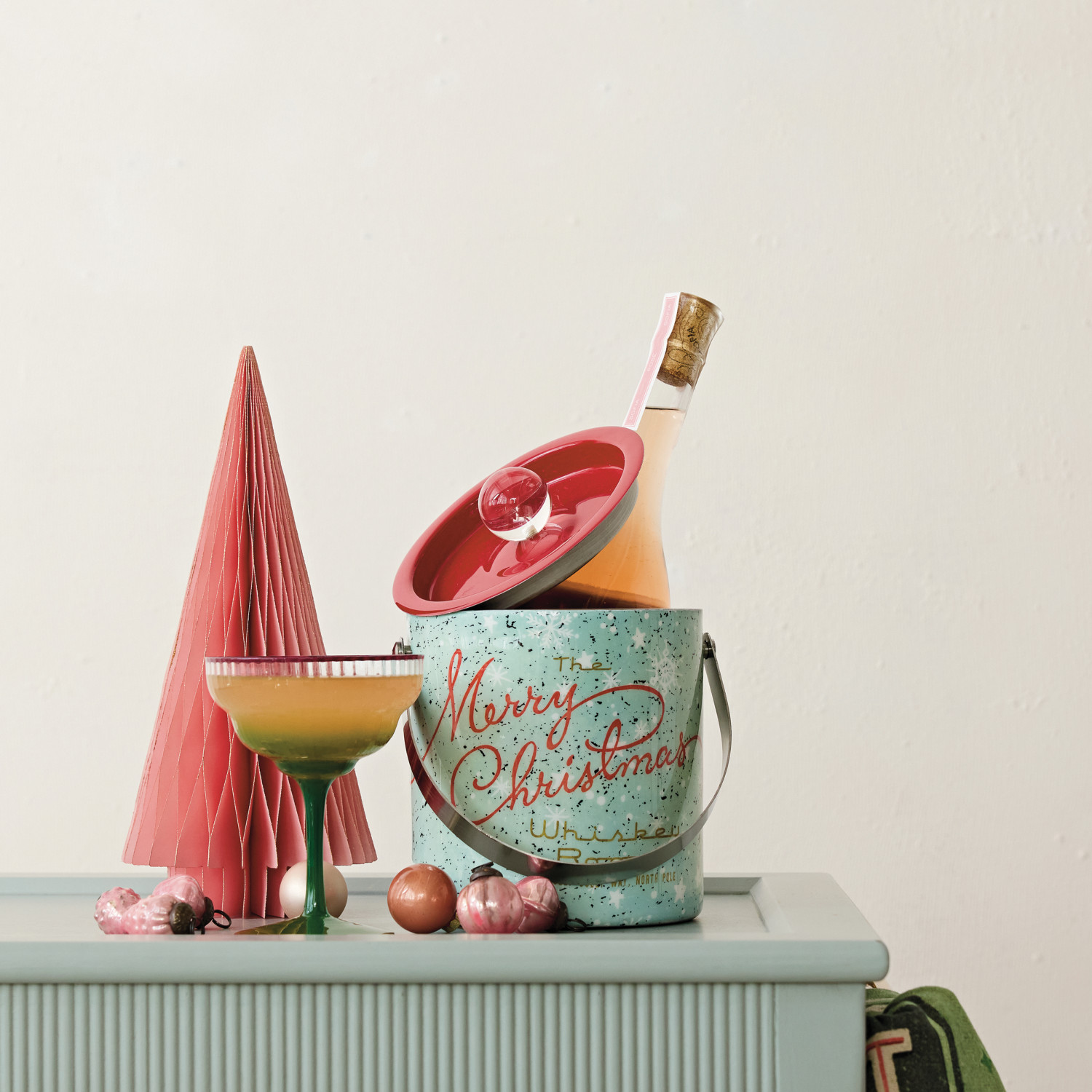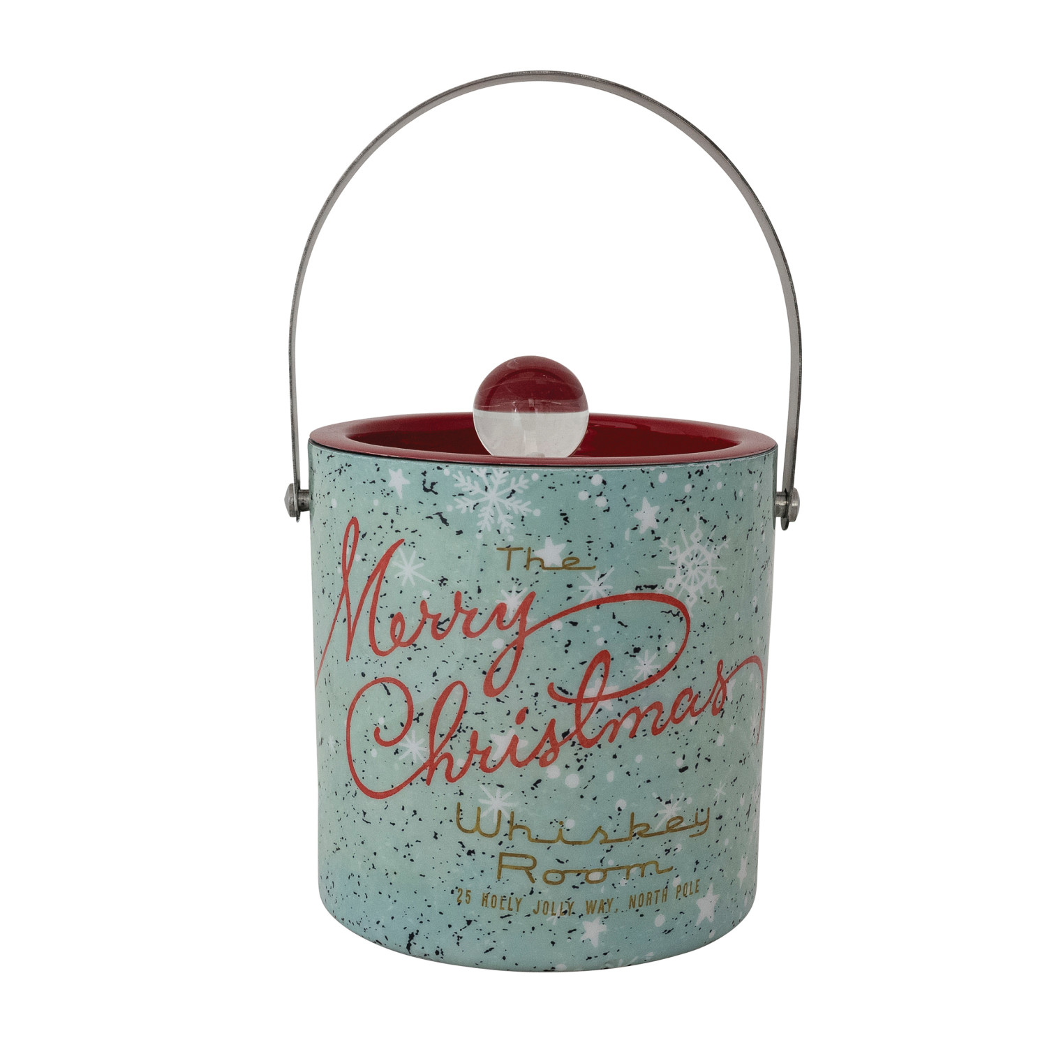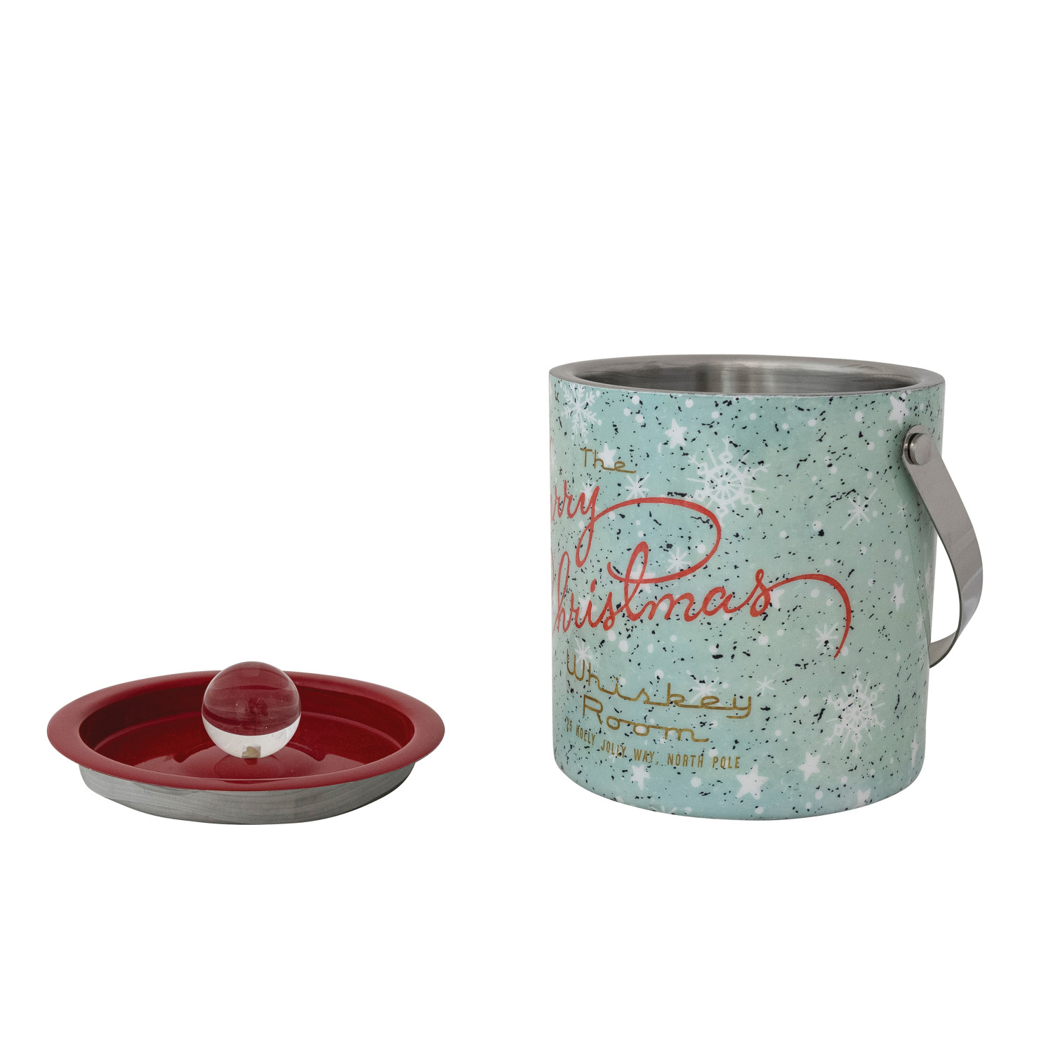 Catalog Name: 6" Round x 7-1/4"H 1-1/2 Quart Enameled Stainless Steel Ice Bucket w/ Snowflakes, Red Lid & Glass Knob "The Merry Christmas...", Multi Color & Nickel Finish ©