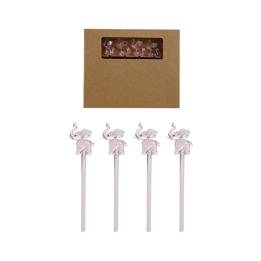 Catalog Name: 6"H Glass Cocktail Stirrers w/ Pink Elephants, Boxed Set of 6