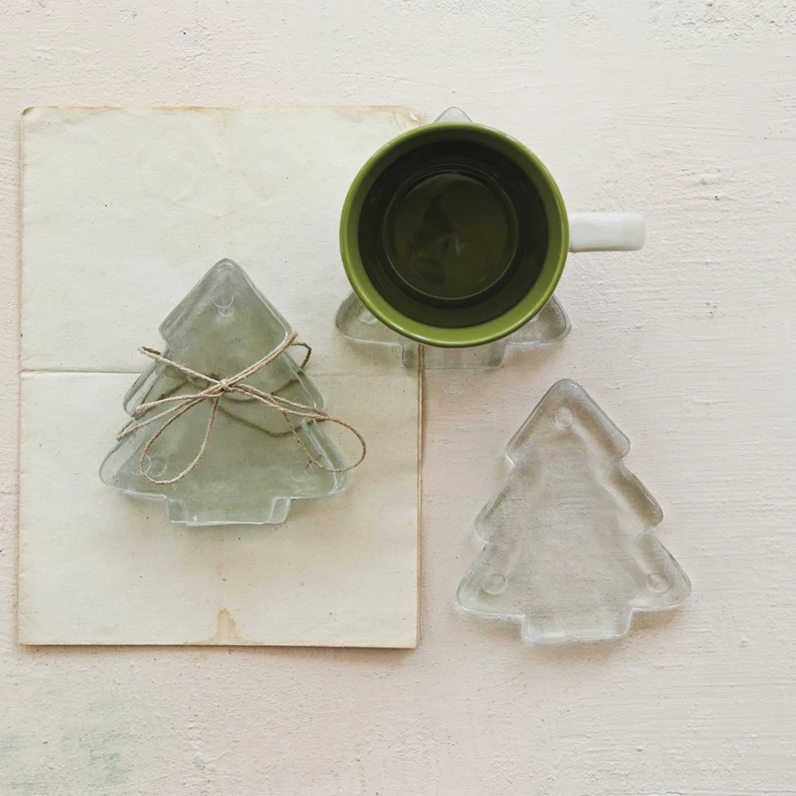 Pressed Glass Tree Shaped Coasters, Set of 4 Tied with Jute