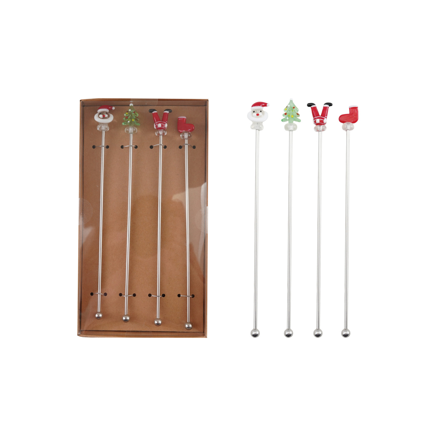Catalog Name: 8"L Stainless Steel Cocktail Stirrers w/ Hand-Blown Glass Holiday Icons, Multi Color, Boxed Set of 4