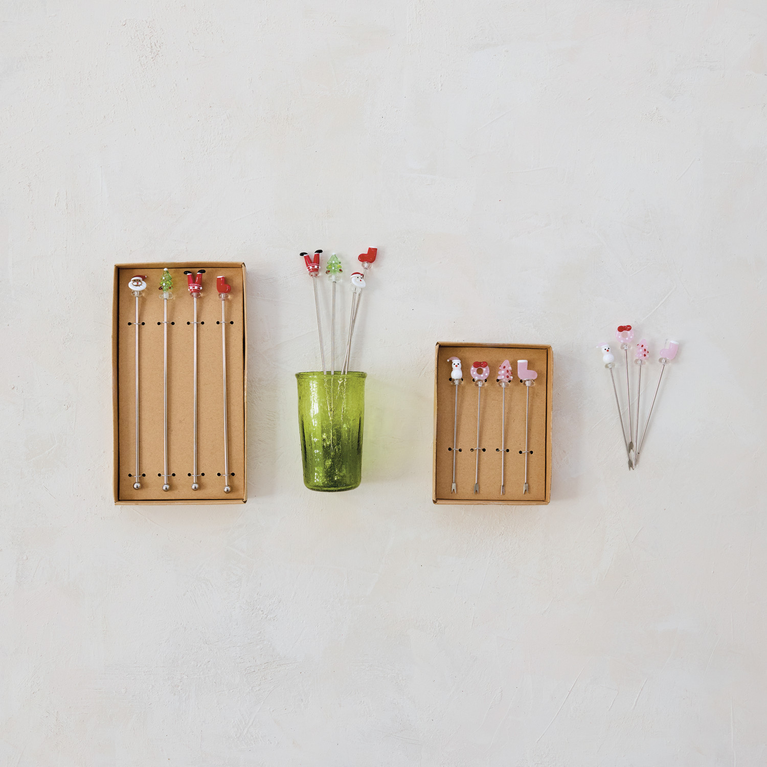 Stainless Steel Cocktail Stirrers with Hand-Blown Glass Holiday Icons, Boxed Set of 4