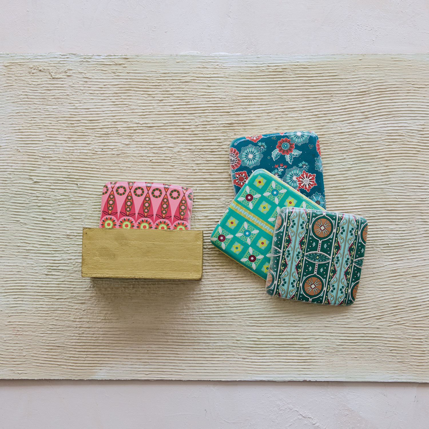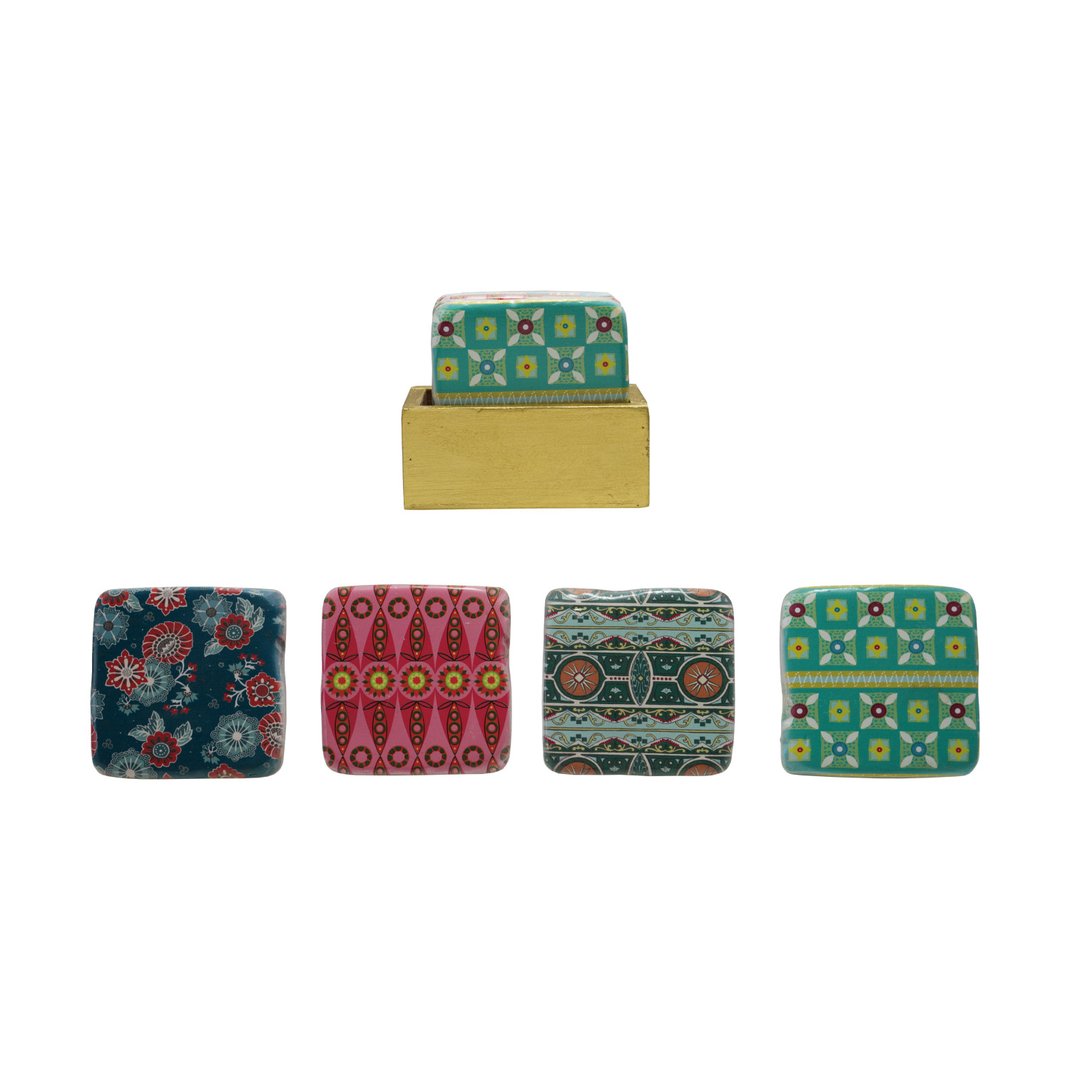 Catalog Name: 4" Square Resin Coasters w/ Patterns in Wood Box, Multi Color, Set of 5 ©