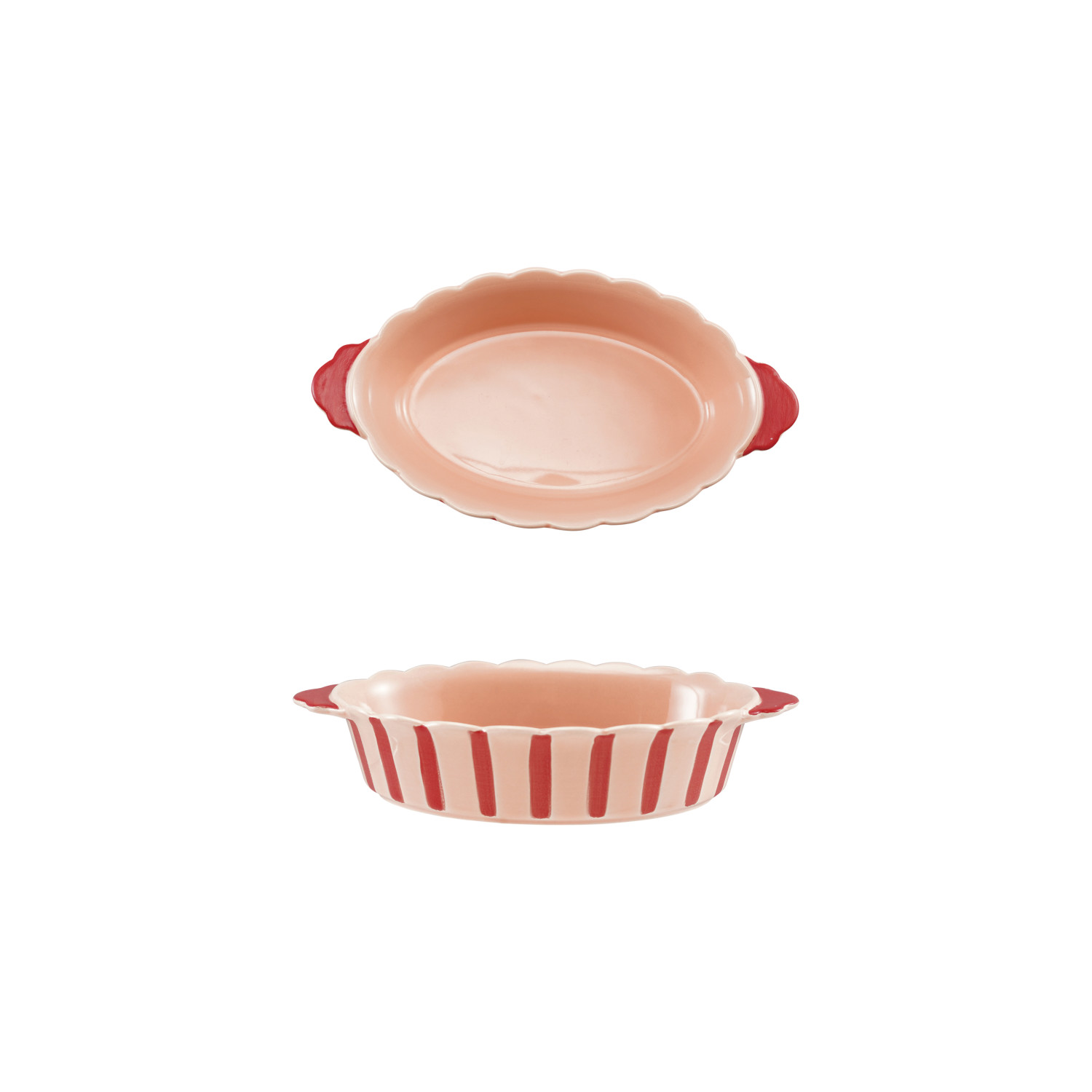 Catalog Name: 10-1/2"L x 5-1/2"W x 2-1/4"H 2-1/4 Cup Stoneware Scalloped Baker w/ Stripes & Handles, Pink & Red