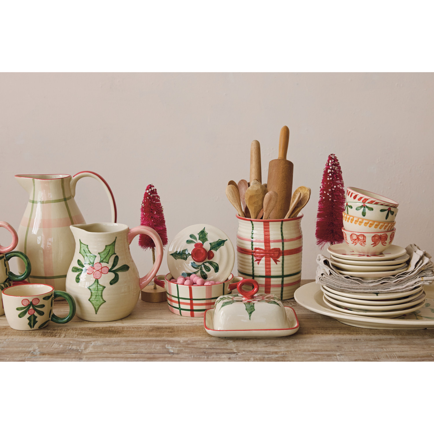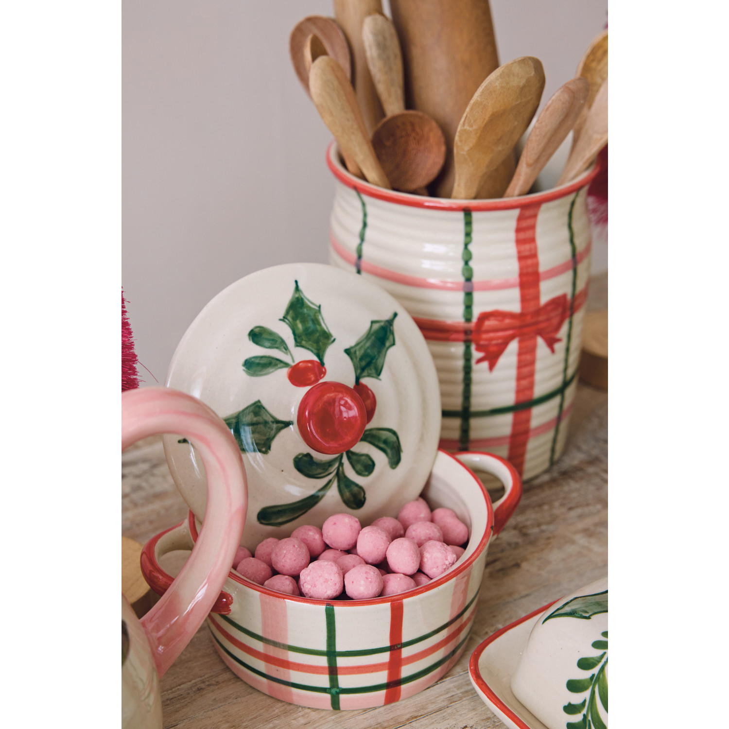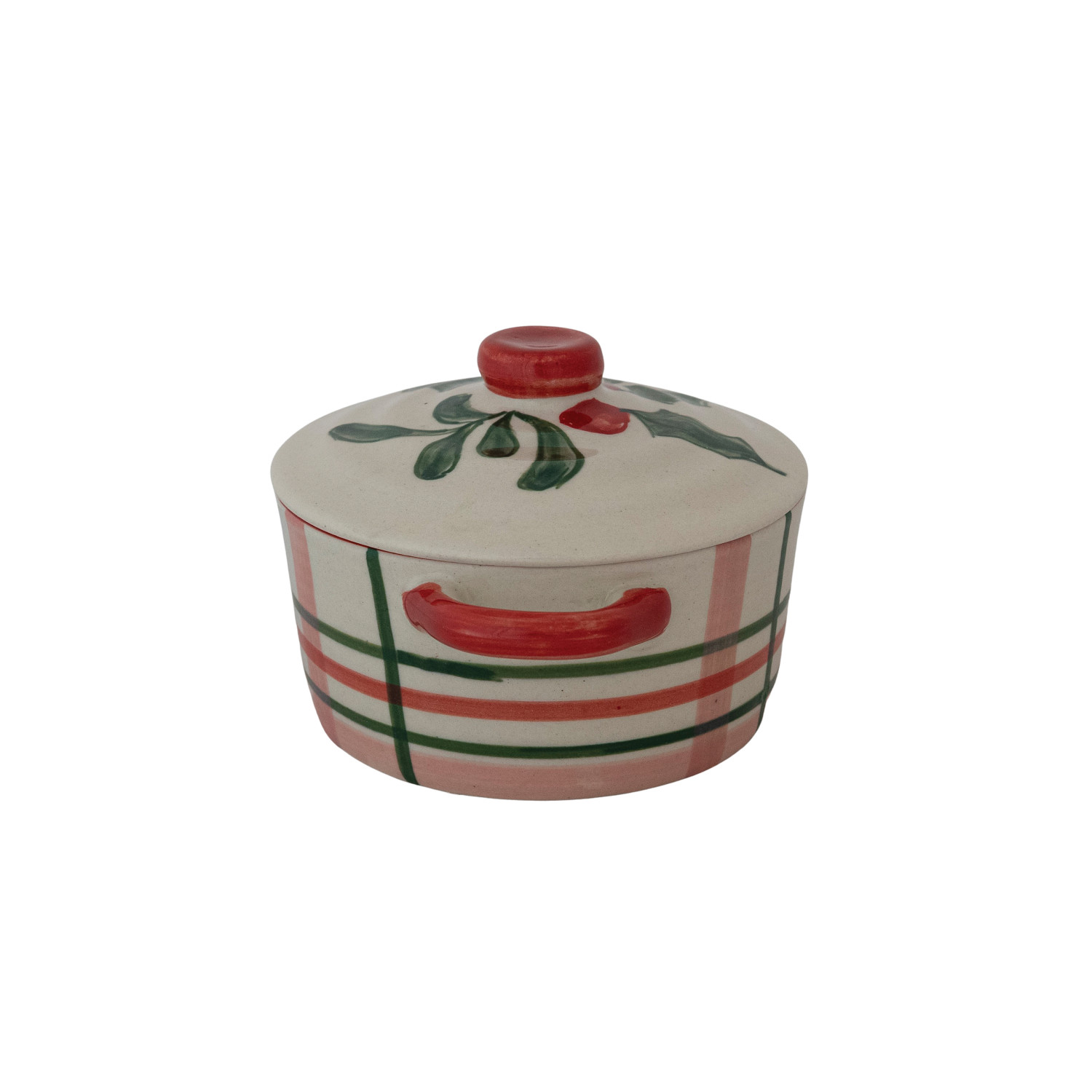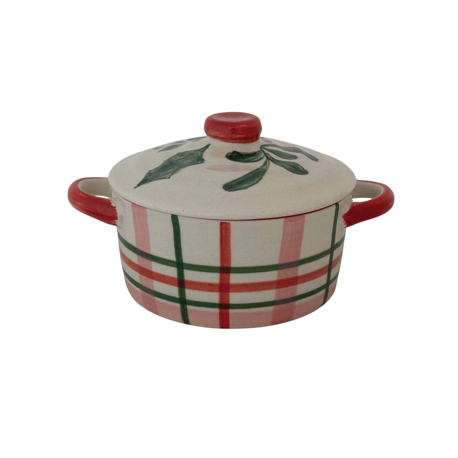 Catalog Name: 7-1/2"L x 5"W 2-1/2 Cup Hand-Painted Stoneware Baker w/ Holiday Botanicals, Plaid Pattern & Lid, Multi Color (Each One Will Vary)