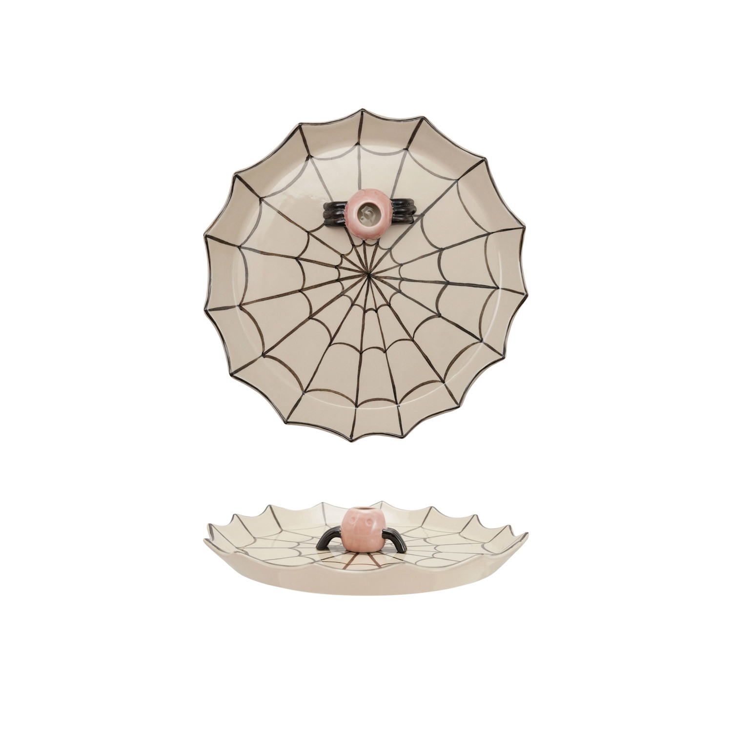 Catalog Name: 11" Round Stoneware Spider Web Shaped Platter w/ 3-1/4"L Spider Shaped Toothpick Holder, Black, White & Pink, Set of 2 ©