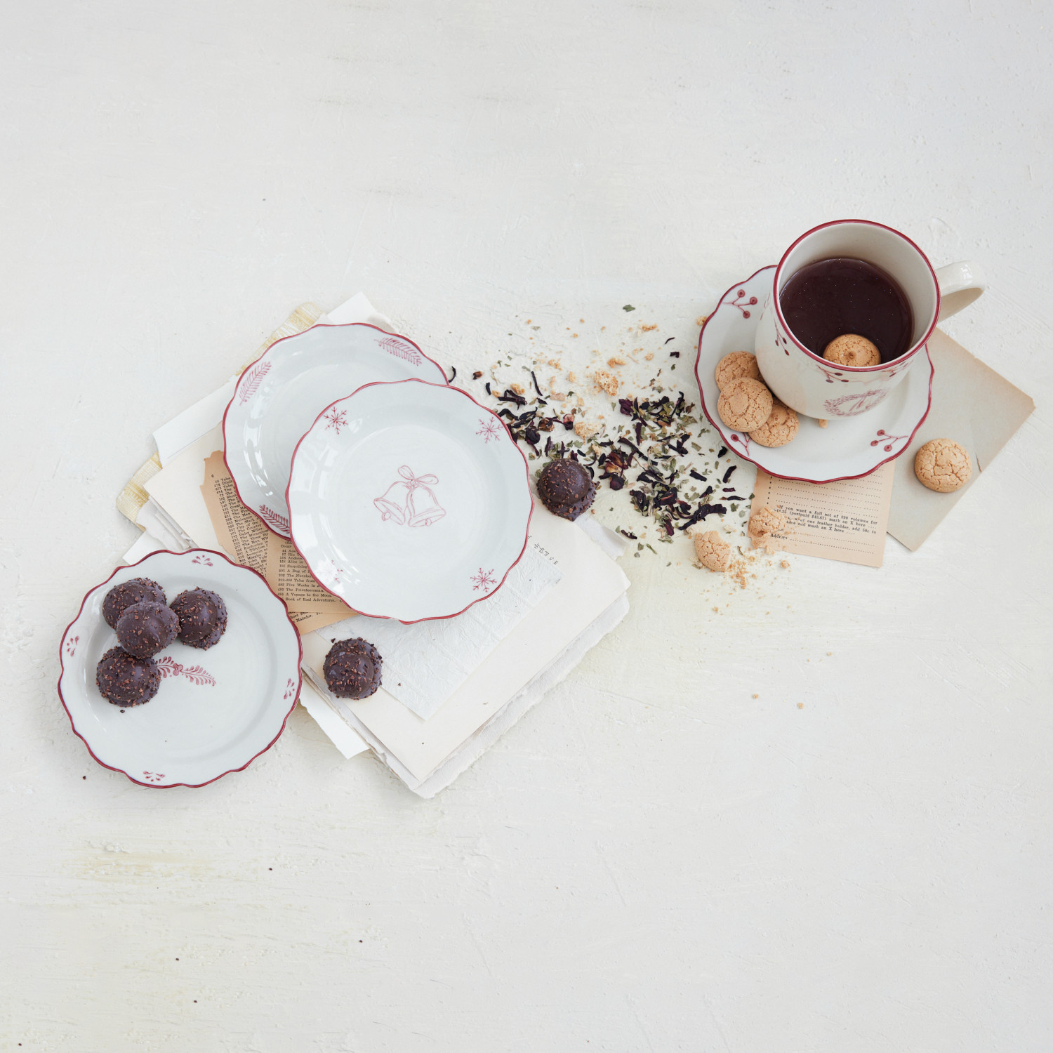 Catalog Name: 5-3/4" Round Stoneware Scalloped Plate w/ Holiday Image & Colored Rim, White & Burgundy, 4 Styles