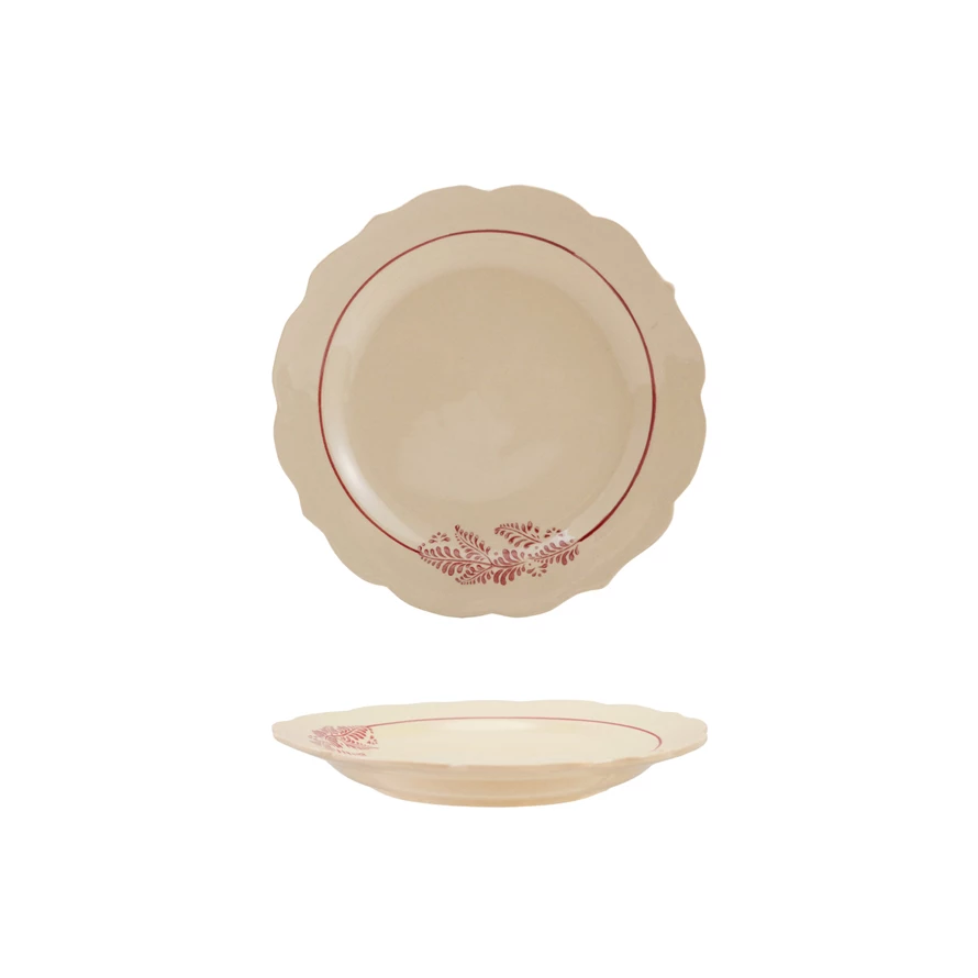 Stoneware Scalloped Plate with Botanicals, White & Burgundy