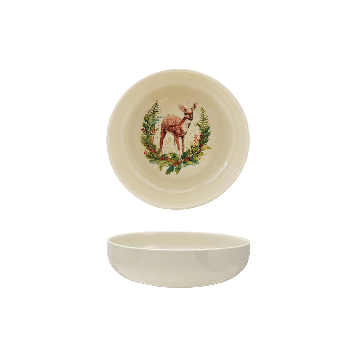 Catalog Name: 12" Round x 3-1/2"H Stoneware Low Bowl w/ Deer & Seasonal Botanicals, Multi Color ©