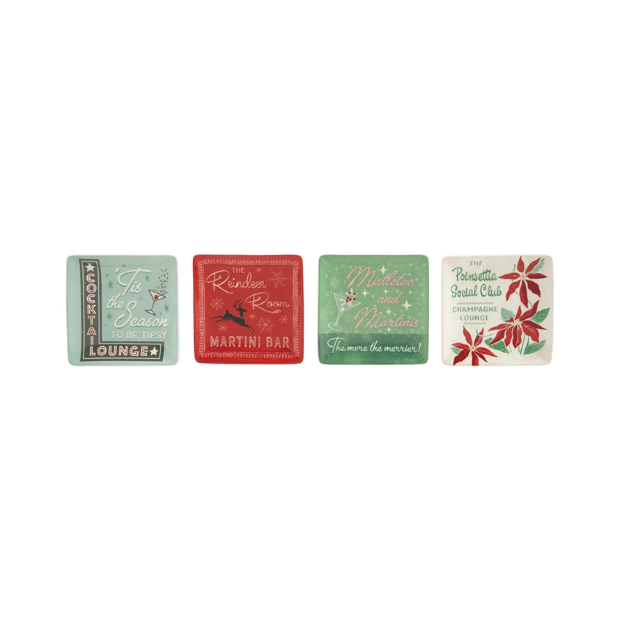 Catalog Name: 5" Square Stoneware Plate w/ Holiday Bar Saying & Image, Multi Color, 4 Styles ©