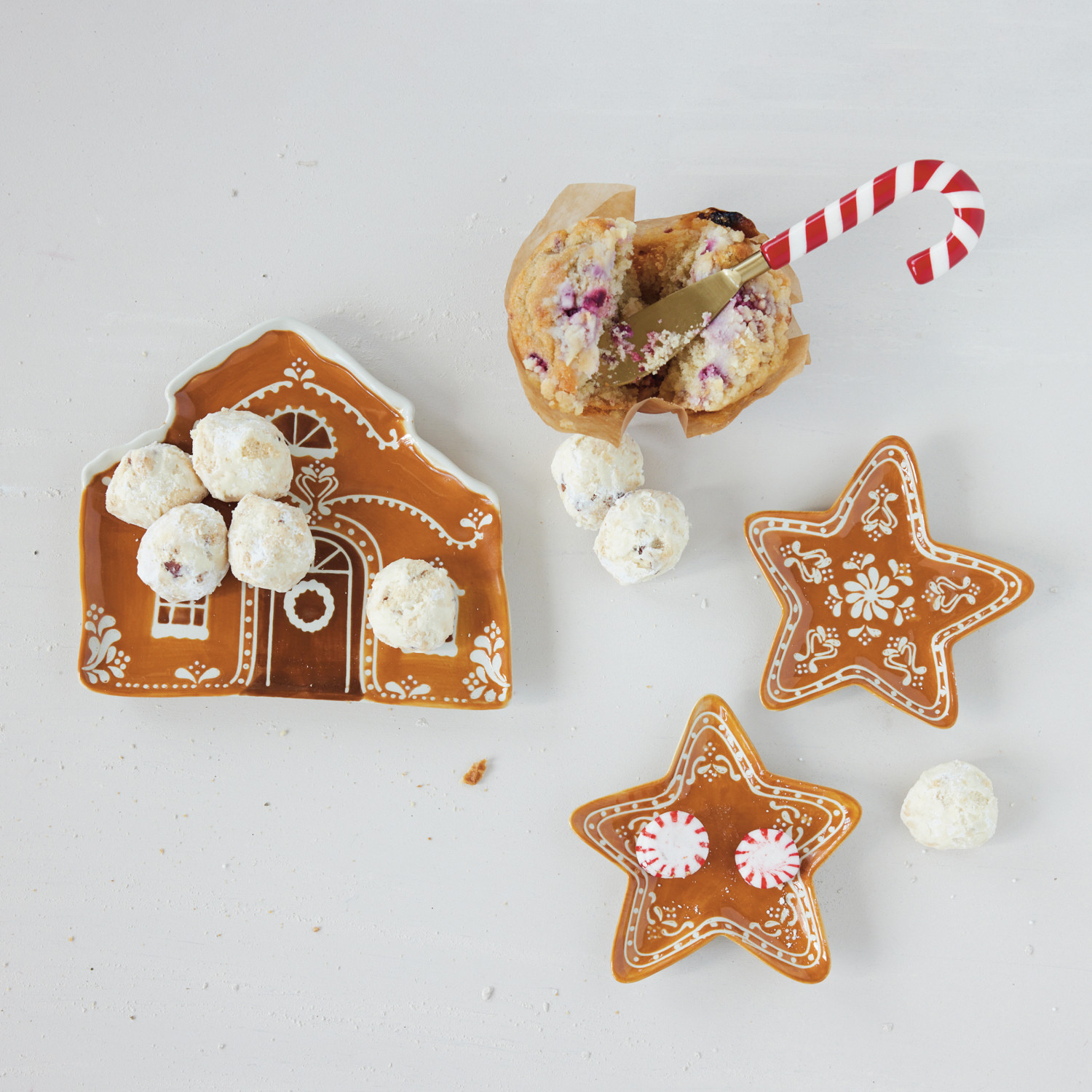 Catalog Name: 7"L x 6"W Hand-Painted Stoneware House Shaped Plate w/ Wax Relief Gingerbread Design, Brown & White