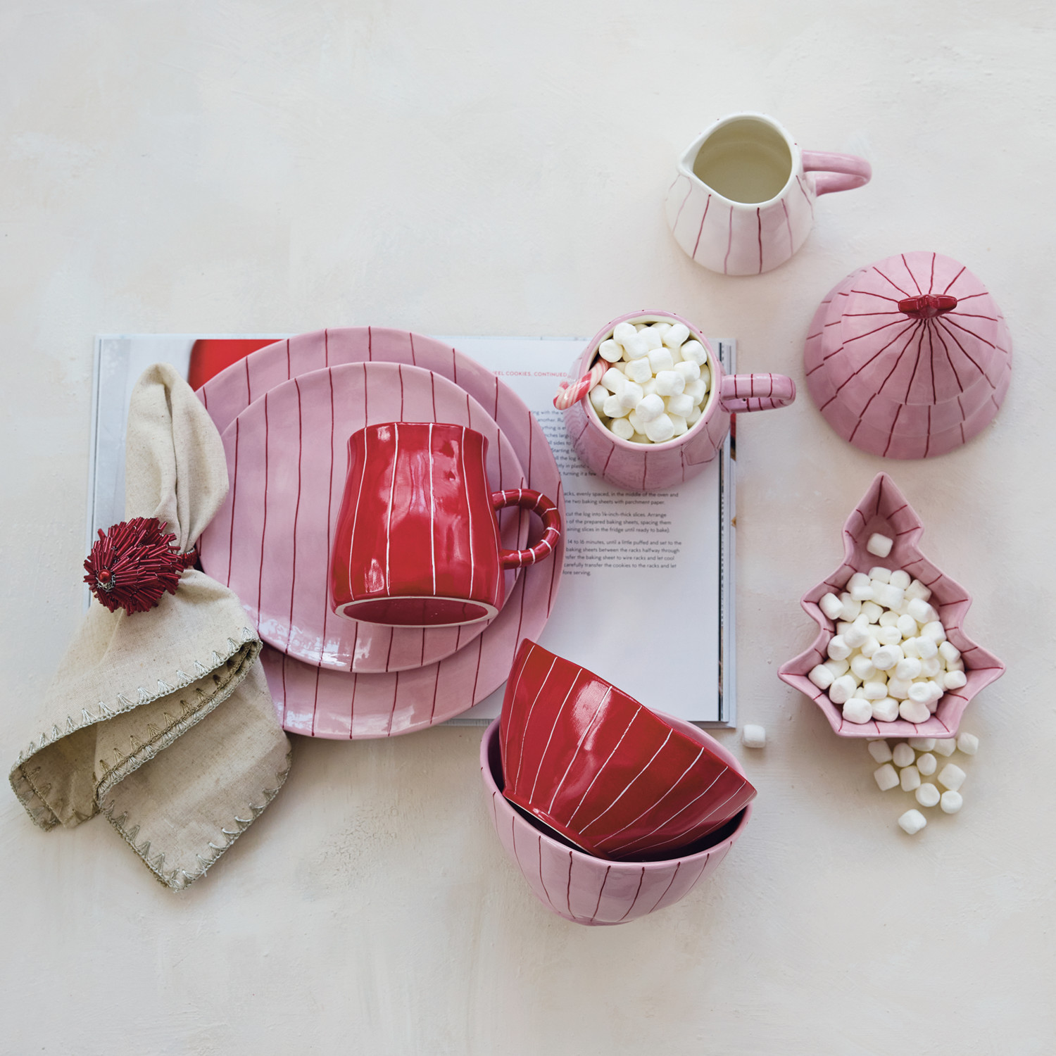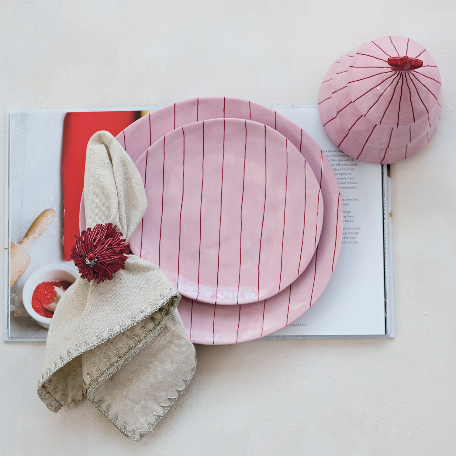 Catalog Name: 8" Round Hand-Painted Stoneware Striped Organic Shaped Plate, Pink & Red
