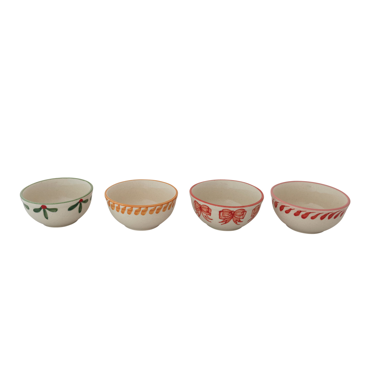 Catalog Name: 4-1/4" Round x 2"H Hand-Painted Stoneware Bowl w/ Patterned Rim & Holiday Image Inside, Multi Color, 4 Styles (Each One Will Vary)