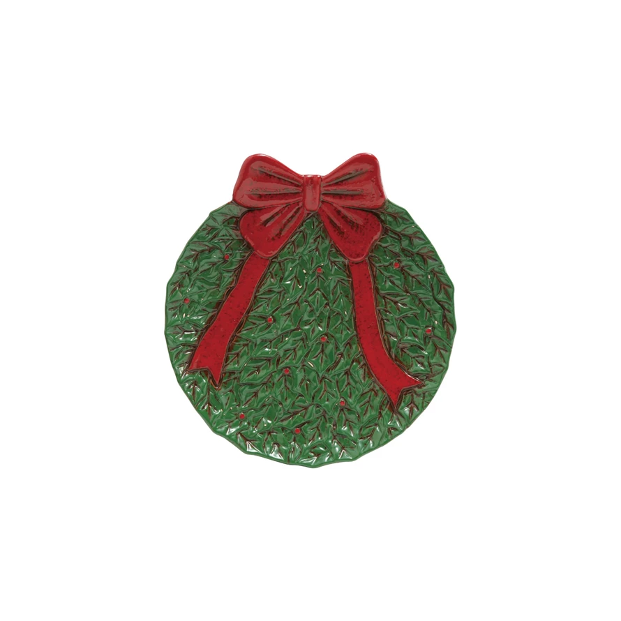 Hand-Painted Ceramic Wreath Shaped Plate with Bow, Red & Green (Each One Will Vary)