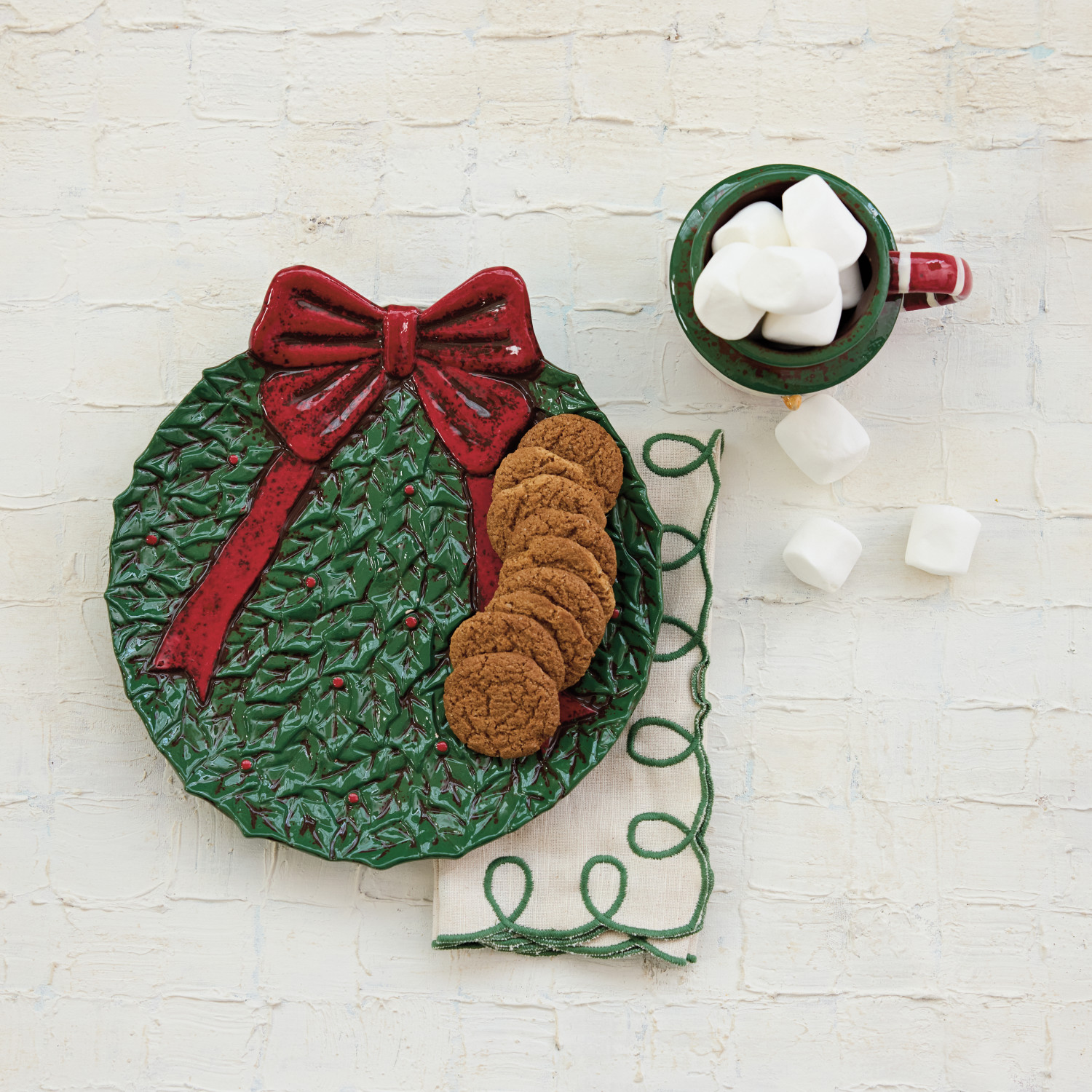 Catalog Name: 10"L x 9-1/4"W Hand-Painted Ceramic Wreath Shaped Plate w/ Bow, Reactive Glaze, Red & Green (Each One Will Vary)
